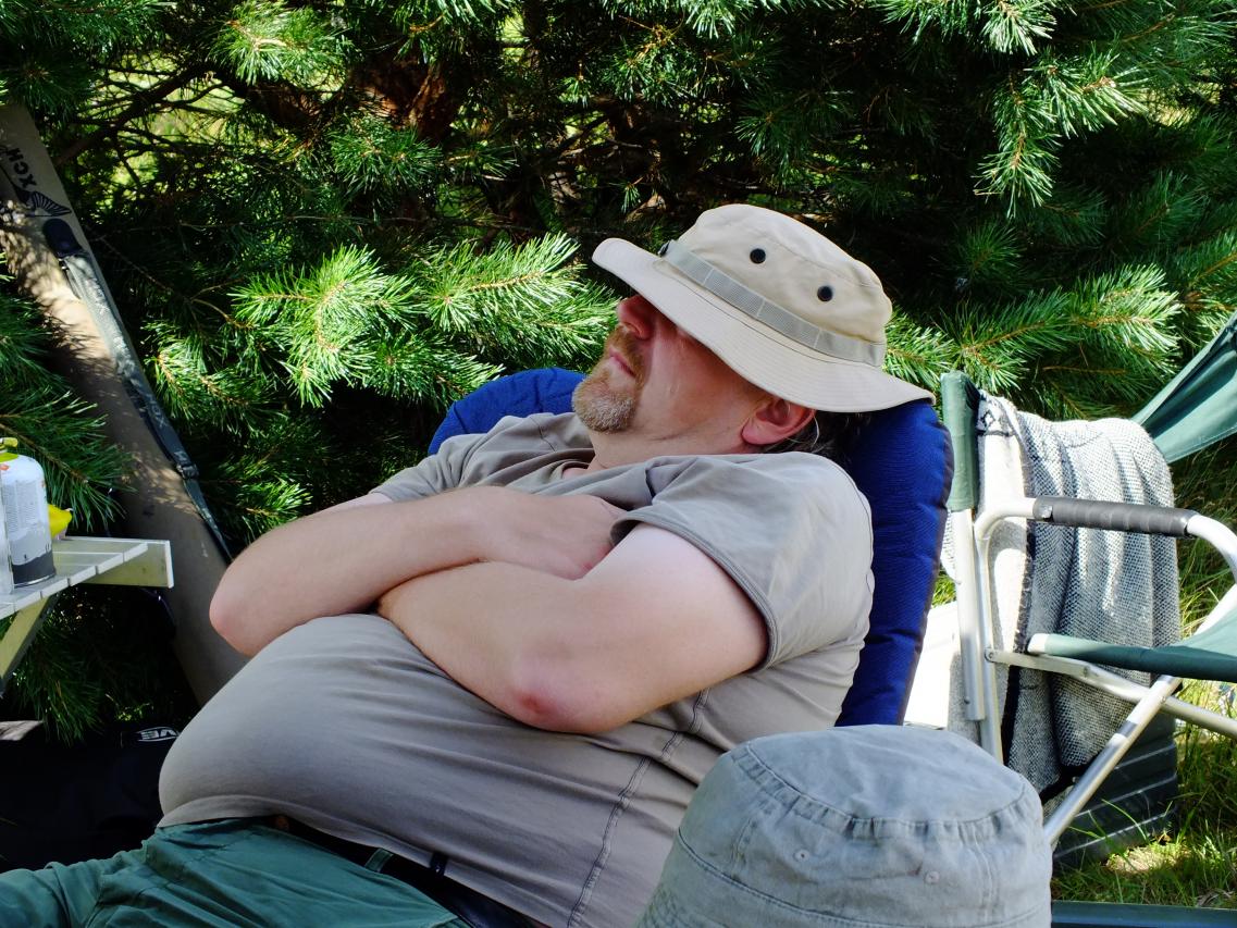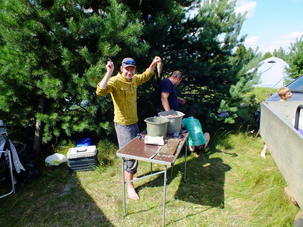 Вот двадцатилитровое ведро окуней начистить , это работа поинтереснее . Желающих было немного , пришлось ходить по лагерю и настоятельно уговаривать. :) Все хотели варить " ленивым " способом , с чешуёй, но я жесточайша :) настоял почистить , в итоге - покушали отварной рыбки всласть , ведь окунь из ухи , когда он не разварен в кашу - сам по себе весьма неплох.