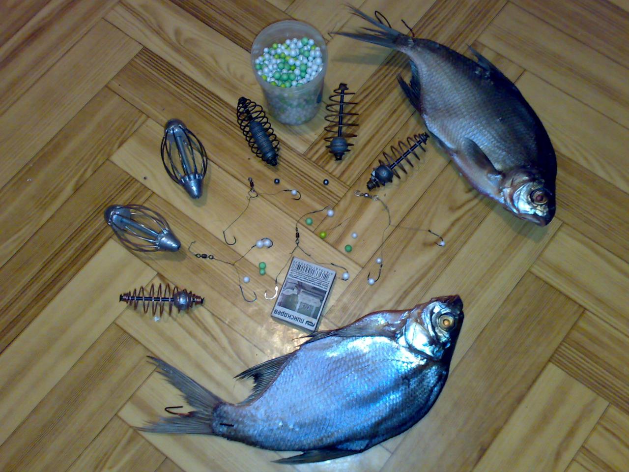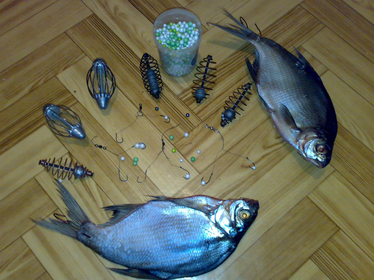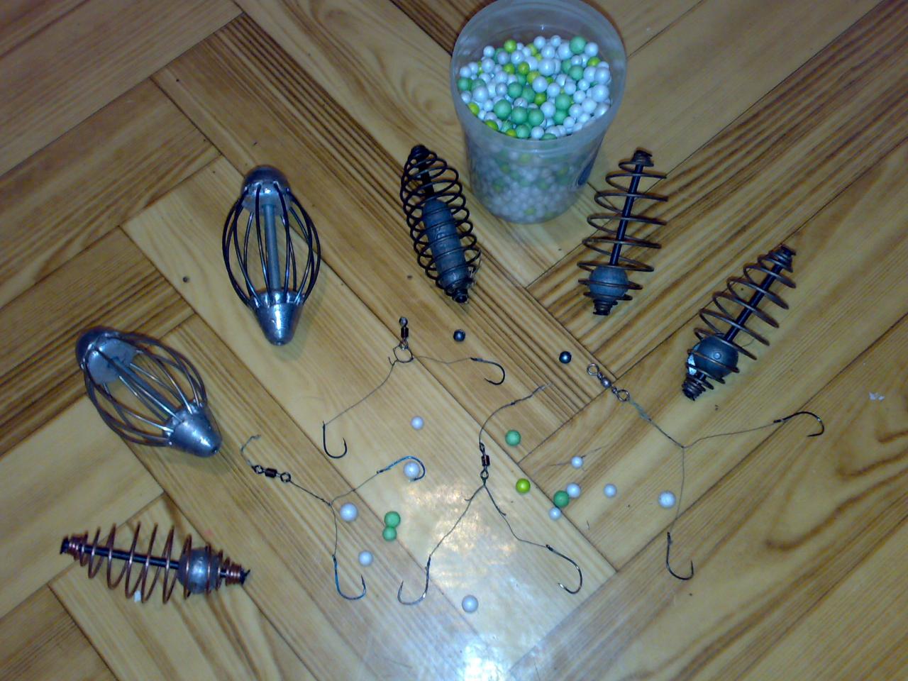 О снасти. Груз-кормушка скользящая (так называемый "огурец" использую), вес ее от наличия и силы течения, толщины лески, глубины ловли, наличия ветра бокового и т.д., в качестве основной жилки - леска или плетенка, и на то и на то клюет, тут что больше самому по душе, к вертлюжку (это вельтруг такой, ну знаете:)) вяжем, между кормушкой и вельтругом:) можно еще бусинку крупненькую надеть, чтобы узел не раздалбывался. Затем к вертлюжку два поводка петля в петлю методом, поводки ставлю исключительно из плетни цвета "хаки" 0,12 плюс-минус. Теперь о длине поводка - это очень важно! Так вот, длина его 5-7 см, ну до 10-ти, на реке некоторые и длиньше ставят, я не пробовал, и так у меня клюет и в снасть свою верю. С крючками не мельчу, овнер 4 само то. Можно и поэкспериментировать с крючками. Пенопласт не крупный, с цветом эксперименты - непочатый край работ, я лично белый люблю (скорее, привычка), протыкается шарик насквозь и на сгиб крюка сдвигается, то же и с салом. Сало можно любое, как соленое, так и свежее, но соленое, на мой взгляд, держится значительно лучше и размочаливается дольше и тонуть начинает позднее. Размер кубика сальца - от размера клеточки школьной тетради и больше, но без фанатизма, на брусок, когда рыбе рот резать надо, чтоб всунуть его:o, не пробовал;):). В кормушку пихаю следующую смесь: пшено+РС всякий, кашка рассыпчатая, эстетики для к рукам не липнуть должна, приятности что рыбалке добавляет только. Ну вот вроде и все. Для наглядности фото нескольких вариантов кормушек и т.д. из личного арсенала прилагается. С уважением и НХНЧ!