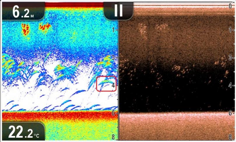 • Vadzim, пока что всё на автомате стояло. Я к цветному привык, но пока не понял,что мне этот цвет даёт:D Но показывает нормально,хотя и думал по началу что на 6м это стаи леща,но видимо подлещ всё таки .