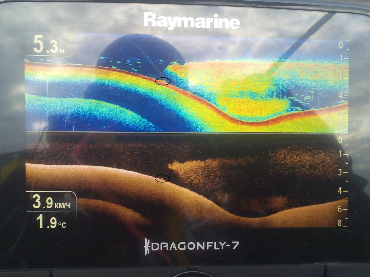 Верхний луч - луч сонара, нижний Chirp Down Vision, нижний больше по "корягам" да и рыбу как видите по размеру "отфильтровывает" :D