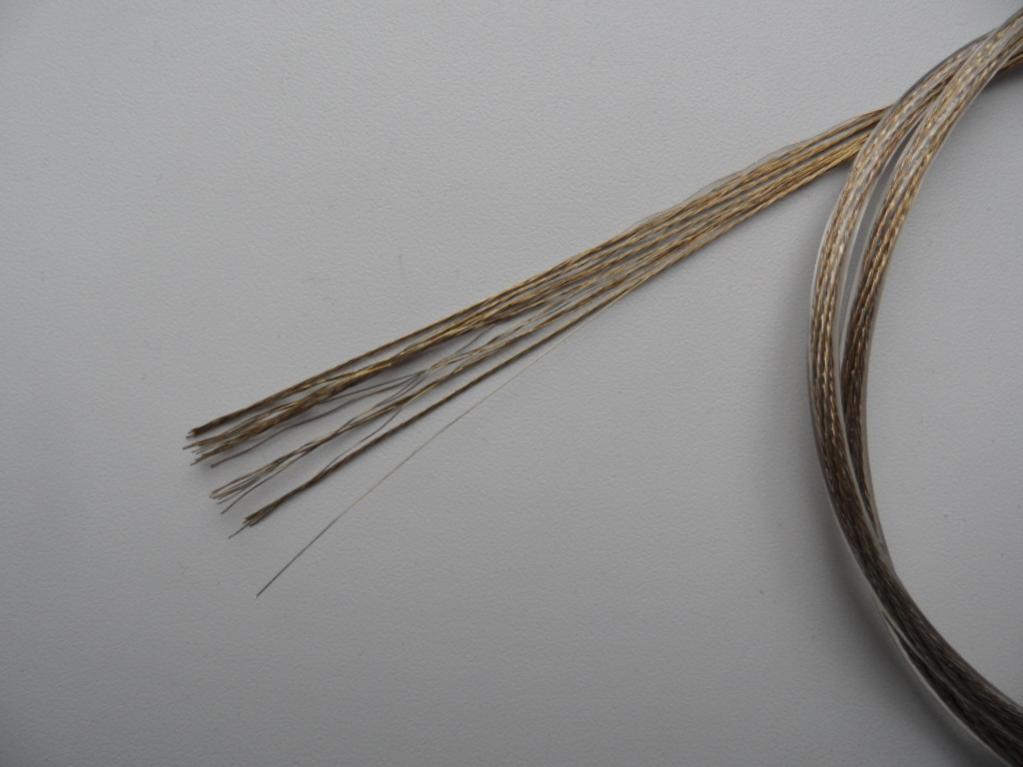 • Делюсь.Проблема выбора материала для изготовления У/Л(стальных) поводков была для меня до некоторого времени неразрешимой,то диаметр не тот,то физические свойства,то цвет. Однажды чисто случайно мне попал в руки тросик в оболочке и ..... Тросик свит из восьми прядок(фото) и в каждой из прядок одна жилка абсолютно ровная(остальные деформированные),то есть в тросике восемь ровных проволочек диаметром 0,15.По свойствам материал ближе к гитарной струне чем к полёвке,не ломкий,но и не легко гнущийся.Такой тросик можно приобрести на строй рынке,заявленный диаметр 3 мм.Нажмите на изображение для увеличения.