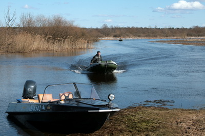 Ну краткий отчет.Выехали из Минска в 9 ,в Слуцке присоединились ребята,возле Солигорска ждал Василий ( в весьма приподнятом состоянии). Прибыли,на Случь.Кто не за рулём по 50 (некоторые по 150).Скинули мой кораблик. На борт никого не брал (мало ли что) стартанул один. Адреналина масса. Со старта мобильник улетел через всю лодку,у меня машина медленее разгоняется. Прокатился по Случи пару км вниз по течке,вернулся к машинам. Взял на борт Василия и Гаврилу,стартанули .По навигатору с таким загрузом вышло 52км.ч. Как выяснилось-винт маловат,нужен на 3 шага больше.Пока катались остальные собрали и спустили свои комплекты на воду.Моторы новые,всем нужна была обкатка.По тиху двинулись. Бедные хлопцы,хоть и солнышко светило но ветер был хороший и явный минус.Как они не задубели.После отьезда Васи у нас на одного стало меньше( стакан тяжелый).Вот несколько фото