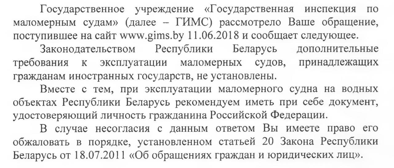 Напомню. Отправлял электронное обращение в ГИМС с вопросом следующего содержания "Имеет ли право гражданин РФ на эксплуатацию на акваториях РБ принадлежащего ему комплекта маломерного судна, не подлежащего обязательной регистрации на территории РФ, с мотором мощностью 9.9 л.с.?"