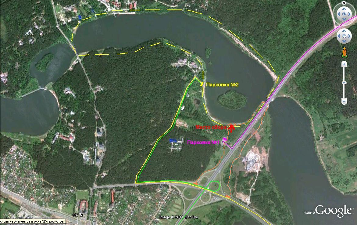Желтый - по бывшему Машерова (Победителей), под кольцевой, поворот направо в лес, указатель "Лазурный", едем до тройной развилки. В качестве ориентира может служить моя машина - чёрный джип Форд Эскейп, собираюсь приехать пораньше. К месту сбора надо будет пройти метров 150 по пляжу.