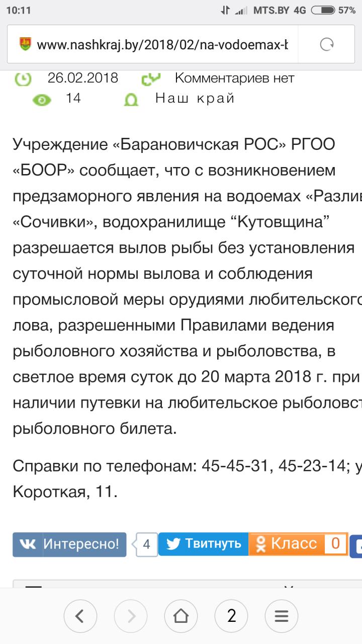 На водоемах, арендуемых Барановичской РОС БООР начинаются предзаморные явления. Лучшим способом борьбы с ними руководство РОС посчитало разрешить вылавливать рыболовам рыбу без ограничения по норме вылова и размера. Членский билет и путевка при этом обязательны. На что рассчитывает руководство РОС? Что рыболовы с радостью понесут свои деньги за возможность просверлить лунки? Ведь любой рыболов понимает, что в замор рыба не клюет. Может быть кто-нибудь объяснит им, что с лучшее средство борьбы с замором - аэрация воды. И если у РОС нет возможности аэрировать воду своими силами, то может следует привлечь к этому простых рыболовов с активной жизненной позицией и не брать при этом с них деньги за помощь, а помощь эту поощрять?