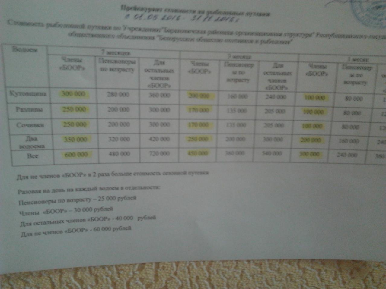 Добрый вечер, уважаемые рыболовы города Барановичи. Может кто подскажет расценки местного БООР на этот год? В прошлом году на сайте было фото с прайсами, очень удобно сделано, может и в этом году будет возможность сфотографировать расценки на путевки?