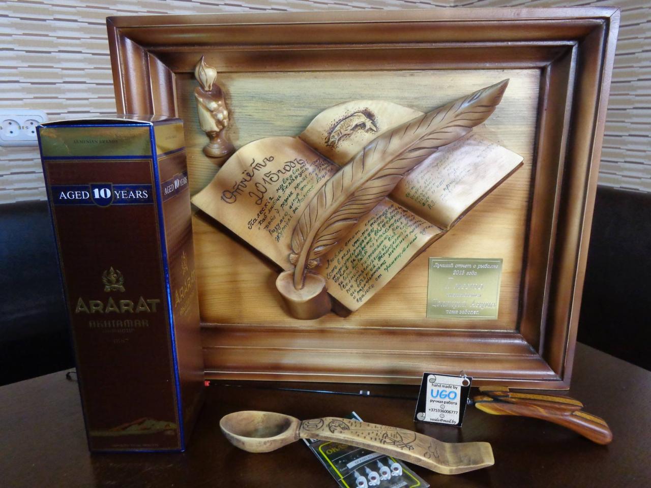 В итоге рад поделиться с Вами, друзья, новостью, которая даёт повод гордиться своими скромными потугами в словонаписании о рыбной ловле и немного похвастаться. Дошли наконец до конечного адресата призы конкурса "Лучший отчёт о рыбалке 2015 года». Доставшееся для меня уже дорого, так как кроме абсолютной эксклюзивности, наделено особыми свойствами. Сделано от души собственными руками моих друзей-соплеменников и способно наделять тёплыми воспоминаниями как домалёжанабоку, так и в рыболовных приключениях. Ну и как в песне поётся: «…да сто грамм без них нельзя»…