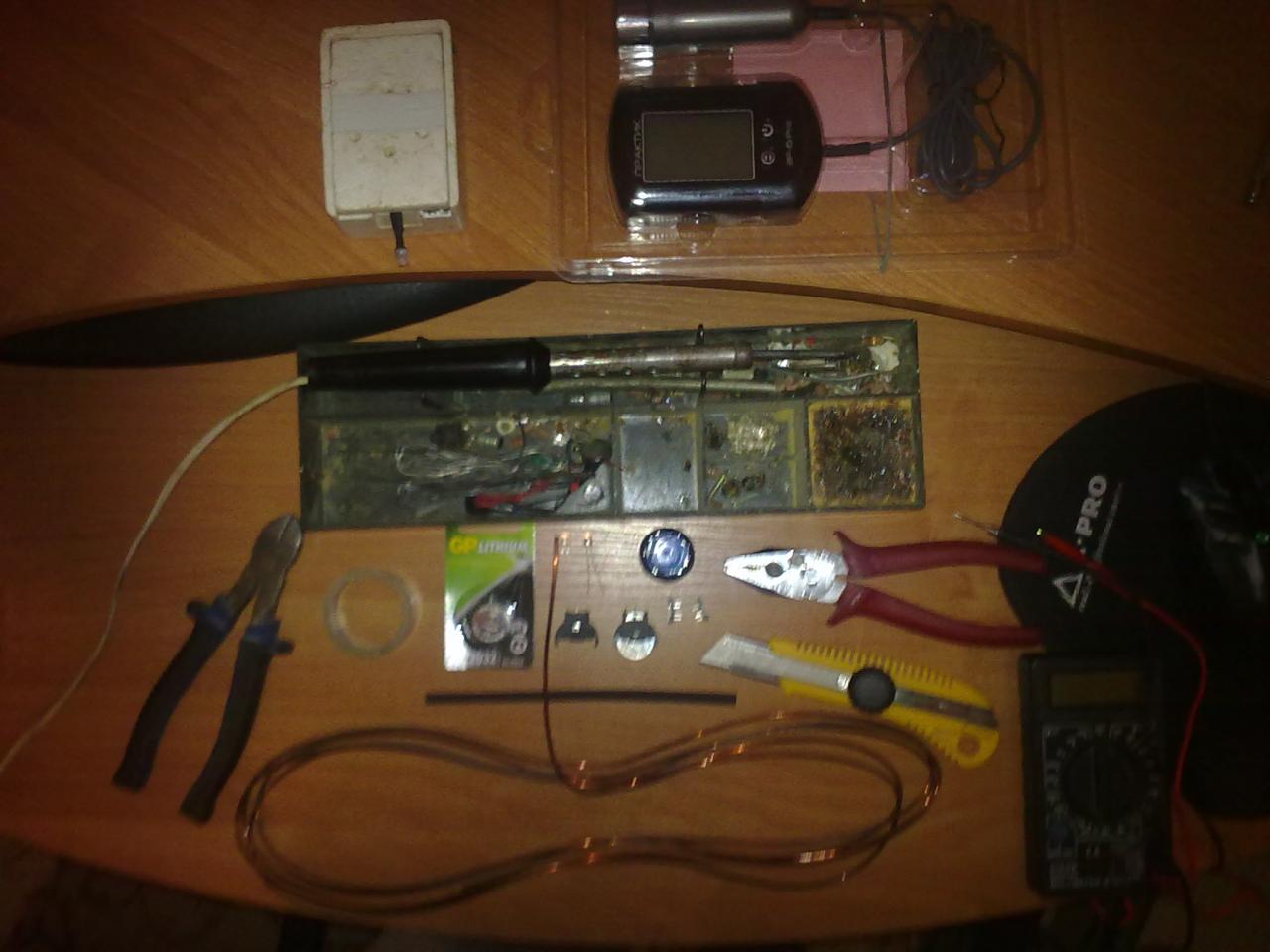 Понадобится: паяльник, припой, флюс, провод (к примеру КСВВ 2*0.4), нож, кусачки, плоскогубцы, медная проволока, мультиметр, изолента, термокембрик, батарейка Litium 3V CR2032, к ней батарейный отсек, движковый переключатель, светодиод (я использую 3.5V синий, выбирайте достаточно яркий).
