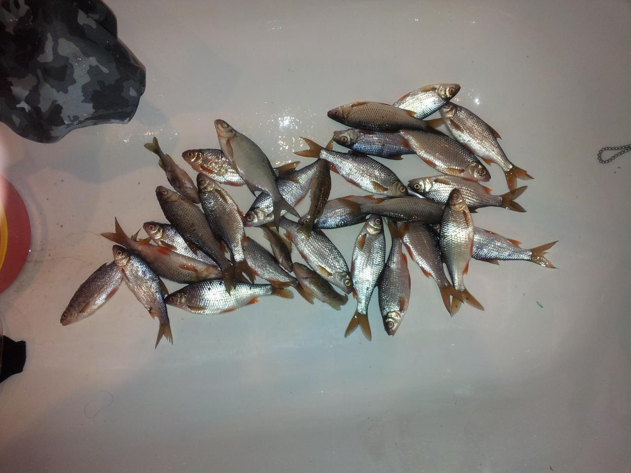• Сегодня в р-не дамбы . Сидел на старых лунках друга , который рыбачил в выхи. Закормил 4х2 чистыми сухарями и с 10 до 15 часов на крючок с мотылем насобирал : 22плотвички , 2 фанерки , 3 ерша и 1 окуня. Размер пивной . Товарищ поймал примерно столько же. Глубина около 7 метров. На игру не хотело.