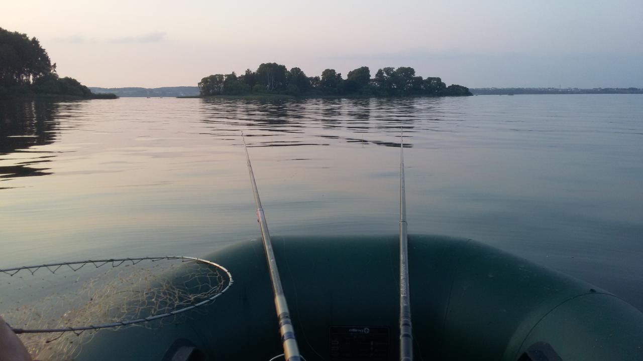 На воде был в 14-30.Накрапывал дождик,тучи носились туда-сюда,в небе наблюдались "звездные войны"-гроза накрыла Минск,благо море обошло стороной..Выбираю нужный ориентир на противоположном берегу и начинаю потихоньку облавливать окружность вокруг моего плавсредства,ищу,то что не могу найти третью рыбалку..До 18 часов результат нулевой,распогодилось,пригрело светило.Озираюсь вокруг - все экипажи долго на месте не задерживаются-значит клева нет.К 19 нахожу подводную аномалию,как позже оказалось это участок дна с разницей в глубине 1-1,3 метра,вокруг 7,6-7,9 метра,а на банке 6,6-6,8,на склонах корчики с дрейсеной,короче то что надо.Заякорившись,начинаю неспешно изучать дно. Простукивается на ура-дно твердое с песочком.Проводка,две,три,тридцать,сорок и подброс приманки.Перекидываю снасть в то же место,снова ударчик,подсекаю-пусто,меняю сЪедобку на другую,провожу неспешно,наблюдая за игрой,снова тычек,подсчечка-ЕСТЬ!Упирается идет клыкастик,благо подсак был наготове.Возле лодки еще больше оживился,не ожидал такой прыти от него,но красавчик уже мой,завесил 1640 гр..Первый судак был взят в 20-05.Минут 20 перерыва,меняю насадку за насадкой,скорость проводки,угол,паузу и т.д. Доходит дело до рачка,ОП,что-то есть,явно окунь,ведет себя уж больно активно,так и и есть 320гр.Смог же заглотить такую бабину,жадина-за то и поплатился..