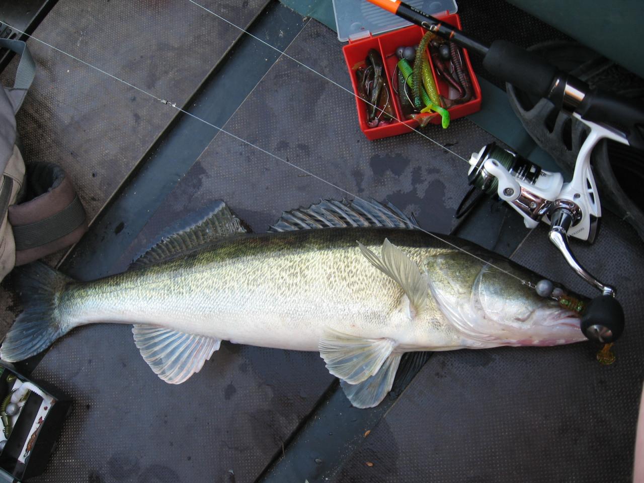 На прошлой неделе в среду выбрались с товарищем обкатать мотор, 5ку и лодку. До 4х проторчали в гимсе, до конца так и не прошли техосмотр, но зарегистрировать успели, а обкатать руки ох как чесались, но у меня все снасти в машине, поехали за спиннингом товарища, вообщем выбор сам собой пал на Заславское водохранилище, по логистике близко. На воду спустились в 7 вечера, прошлись по руслу, дорожили - тишина. Начали подходить в район Семково и за метров 200 у берега удар, есть! Взял на рапаловский длинный воблер, фиолетового окраса. Немного поборовшись поднял судака, подсак как всегда в машине… А судак неплохой, подтянув к лодке, товарищ завел кукан под жабры и оперативно защелкнул. Единственное судак сильно заглатил воблер, и я пока гемороился с извлечением приманки из пасти, в азарте опер данную селедку о борт надувной лодки, видимо как раз спинным плавником, чем чуть не вызвал крушение нашего судна))) . Лодка получила прокол, который за отсутствием ремкомплекта я заклеил наклейками с коробок от воблеров. Поплавали еще часик, у товарища было пару нереализованных поклевок, у меня тиштюина. На Минском море рыбачил первый раз, водоем понравился. Судак завесил 4.7 кг.