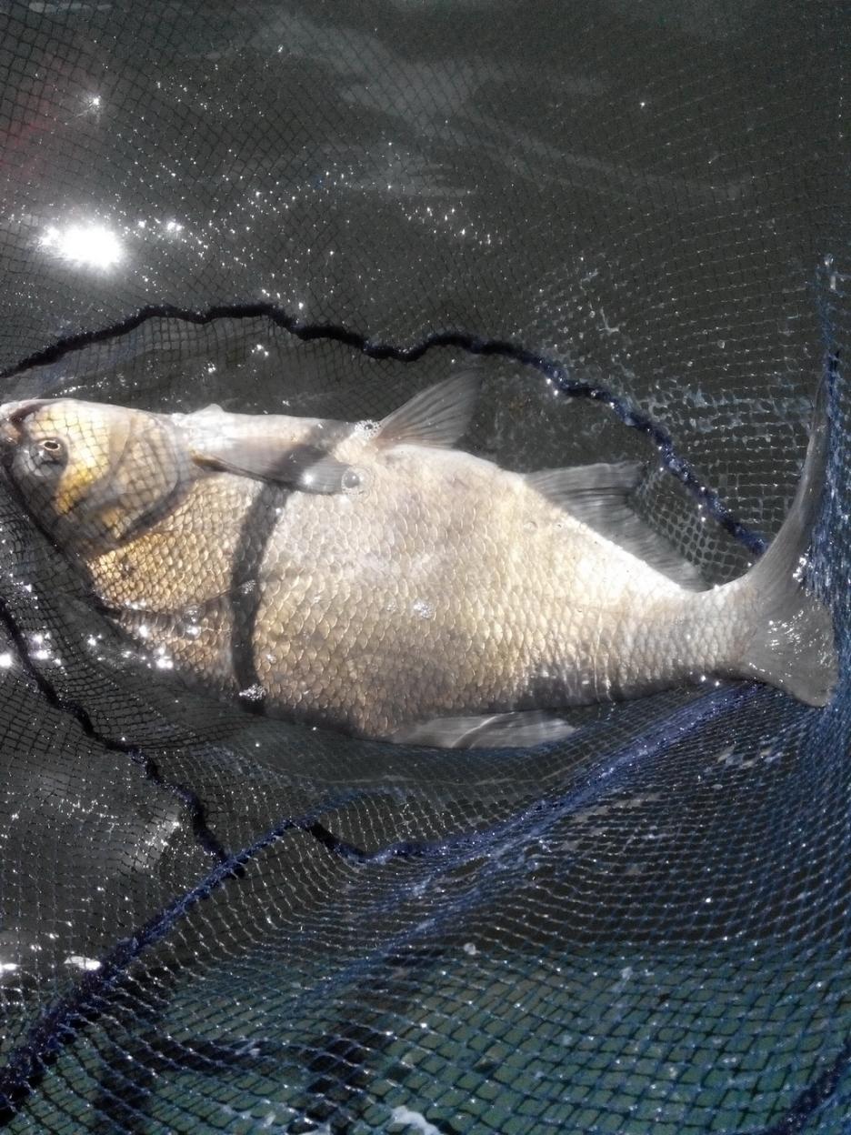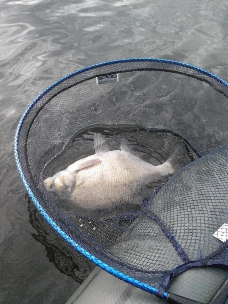 Быстро перекладываю из подсака в садок. И снова в бой. На этот раз мотыль - опарыш. Пришлось подождать, так как предыдущий парниган несколько раз проплыл по точке ловли и, видимо, всех разогнал. Тем не менее вторая поклёвка есть. И снова лещ поднимается пол пути легко, и только с середины резко стартует в сторону. Минут 10 и круг вокруг лодки...Вот и всё на что хватило этого красавца..