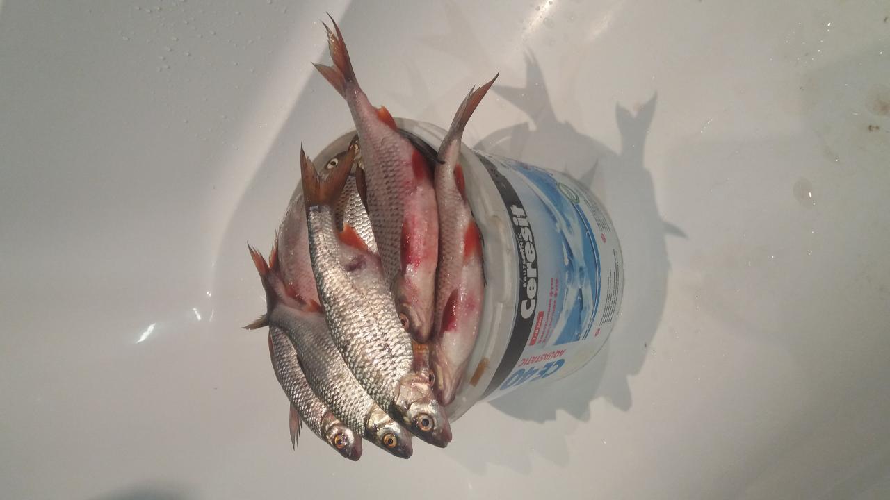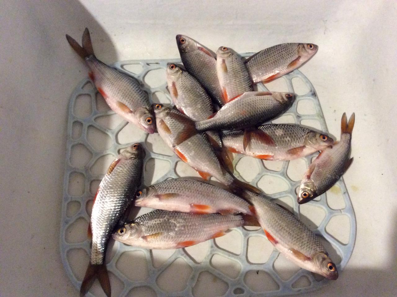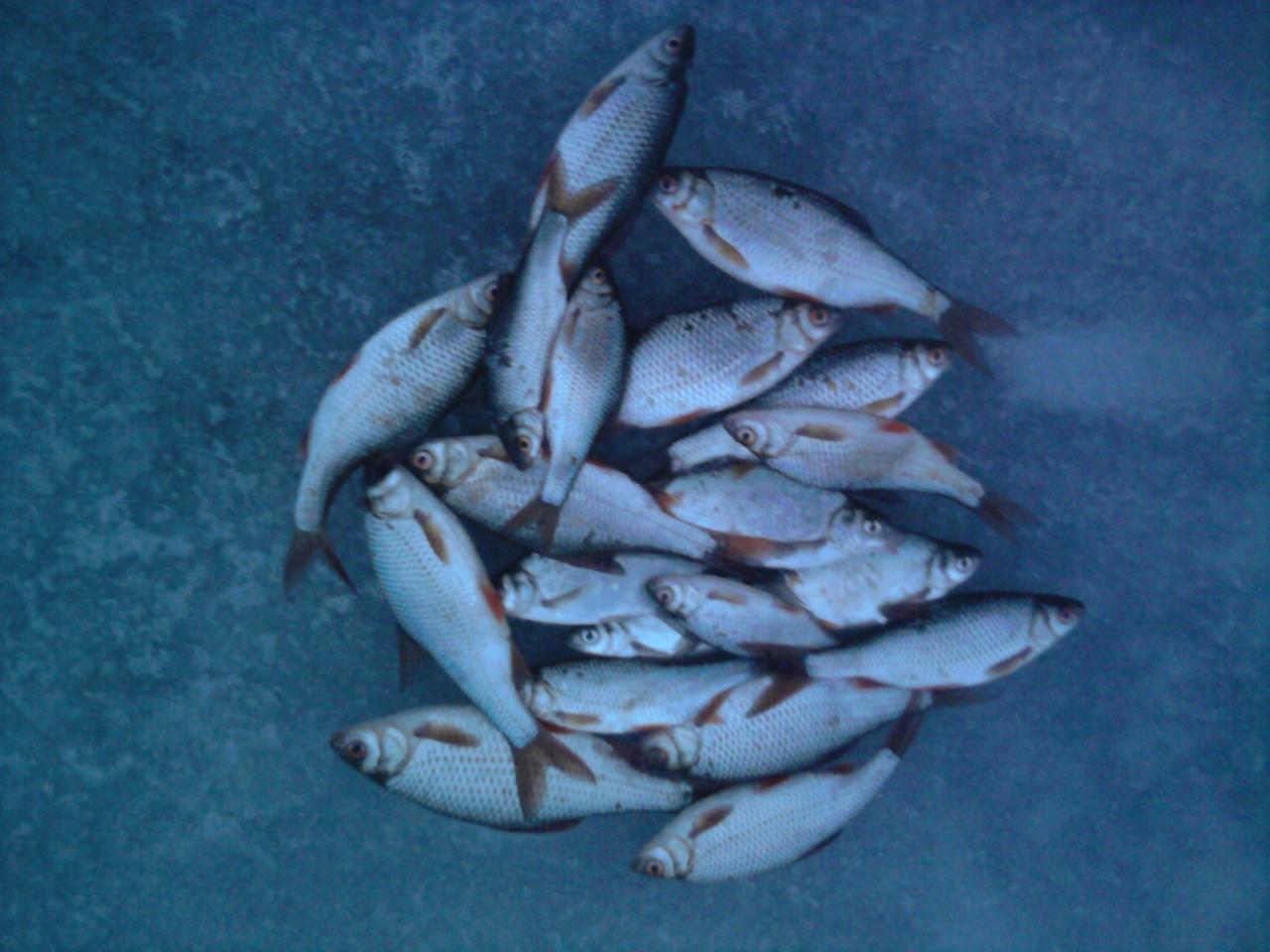 • Привет. Вчера (25 декабря) с 9.00 до 17.00 район Юности. Подкорм сухари, ловил на мотыля. Глубина 5.3 метра, лёд пока неплохой 8-10 см. Клёв был с 12.00 до 13.30, потом затишье. Возобновился в 15.30 и поклёвовало до темноты. Было поймоно 35 голов: 2 ерша, 4 подлещика, 1 окунь и 28 плоток. Общий вес 2.1 кг.