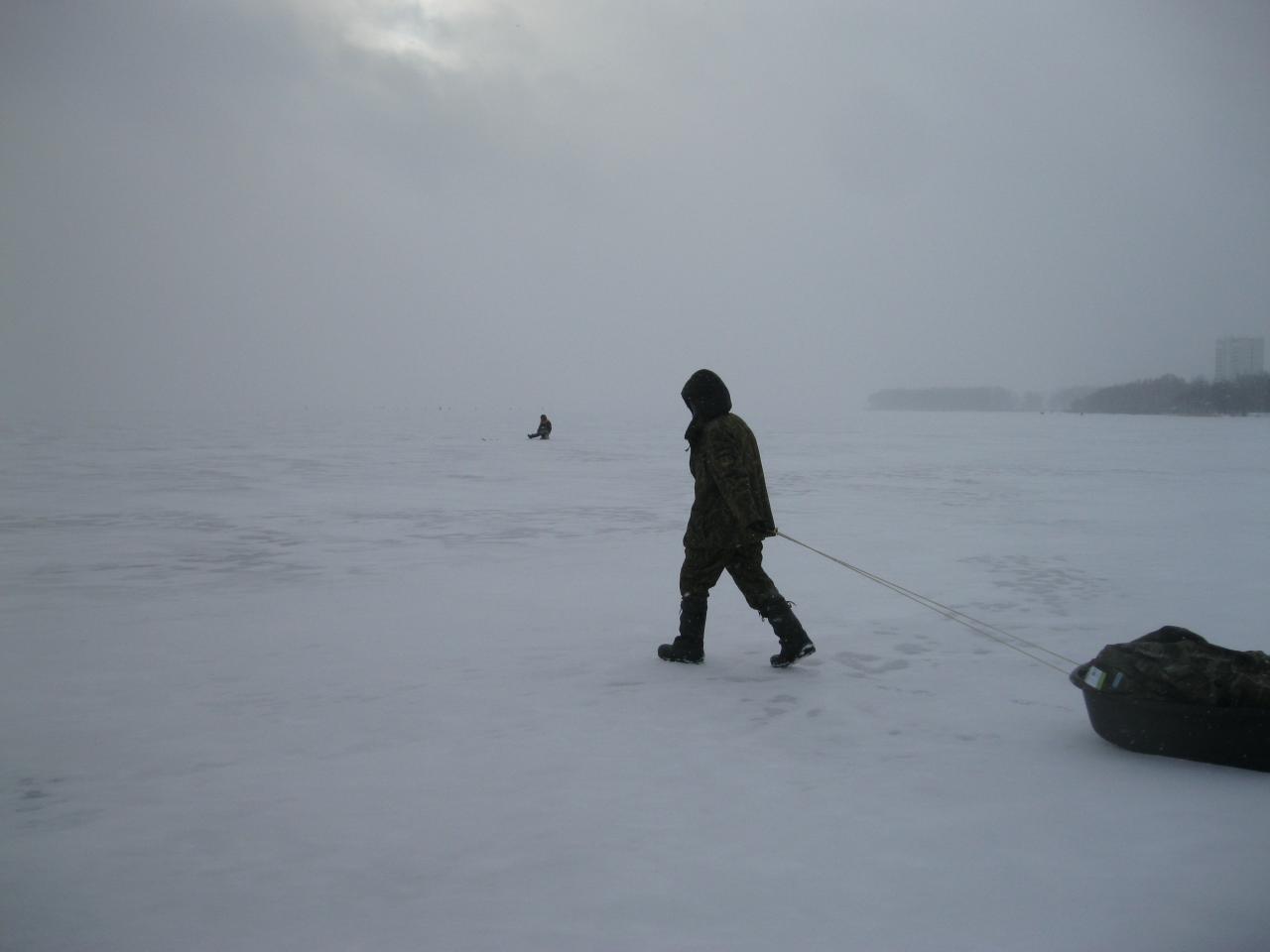 И несмотря на погоду, мы все-таки пошли. От Гонолеса до берега Лапоровичей. Сначала "черт" гонял меня по лункам, потом я теребил свою "балду", а Владимир 70 упорно "мормышил". Долго там не высидели (с 10.00 до 12.00 примерно) - ветер сдувал вместе с ящиком. Потопали обратно с небольшими остановками. Спрятались в заливе за "горбатым" мостом, где ставок почти всегда полно (сегодня тоже были). По всему маршруту на разных глубинах - от 1.0 до 3.5 м - наноокунь, микроерш и милллиплотва.