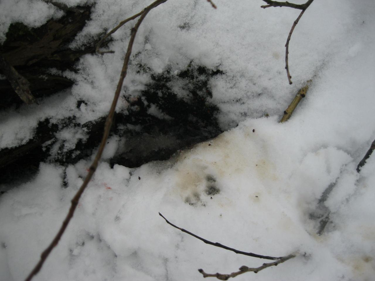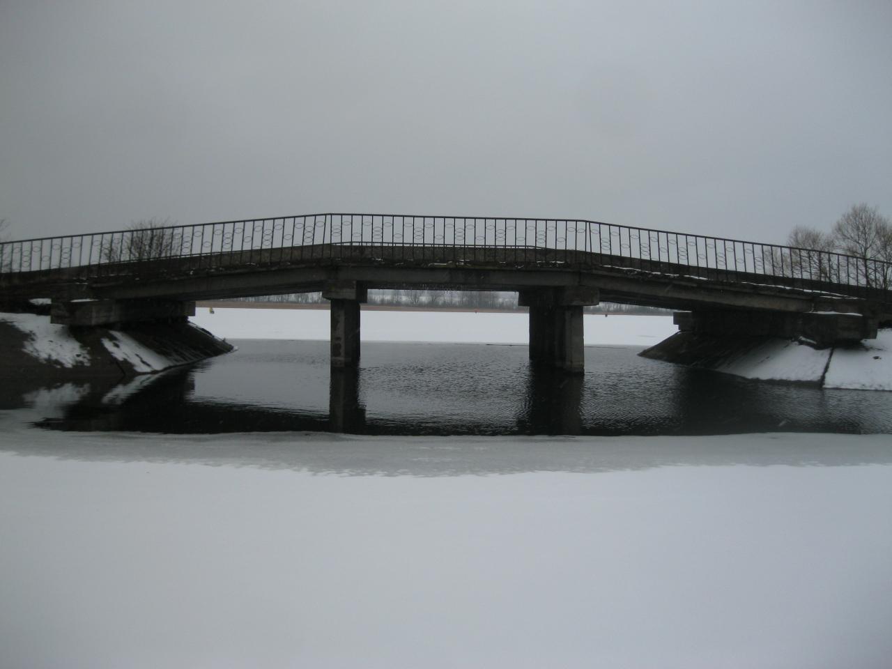 За мостом все тоже самое, ничего нового. Зато наблюдали, как по краешку льда, вдоль самого берега, какой-то темный пушистый зверек с хвостом тащил в зубах рыбину, чуть ли не больше его самого (с хвостом). Посмотрели по следам - видимо, поймал где-то в дальних камышах (мы не полезли) и принес к себе в норку.