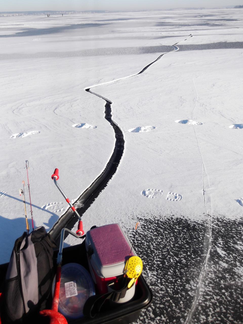 На море был к 13,пока дошел до нужного места уже было 13-30,сразу отмечу,что там первый раз и искал нужную точку,которую условно знаю,только я.До вечера встретил мимо проходящих 3 судачатника,но у всех по нулям.Попозже подтянулся "дружбан по болезни" voodoo_people ,вместе и начали искать клыкастого,где-то к 16 часам первый подброс блесны,замена "блестяшки" не дала результата.На ММ есть вот такие места,толщина льда в трещине 2-4 см,благо трещины в этом месте были не большие..Нужную точку за всю рыбалку,так и не нащупал,но будем искать,еще пол зимы впереди..Глубины где "судачили не колебались больше чем на 30-35см,ровное плато с небольшим заилением дна.