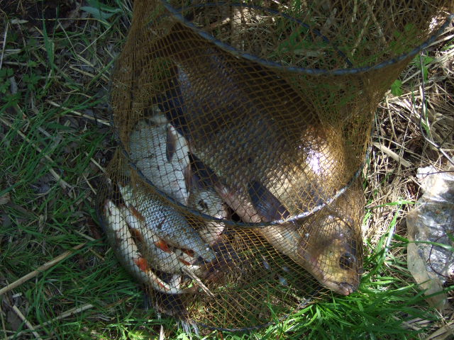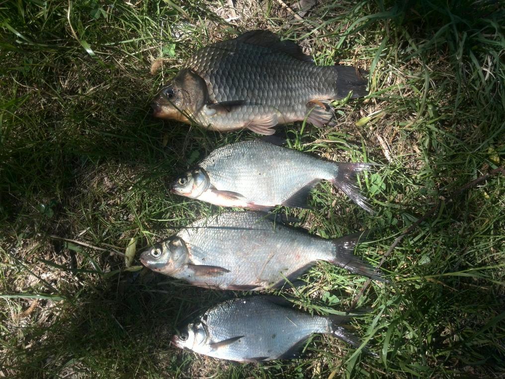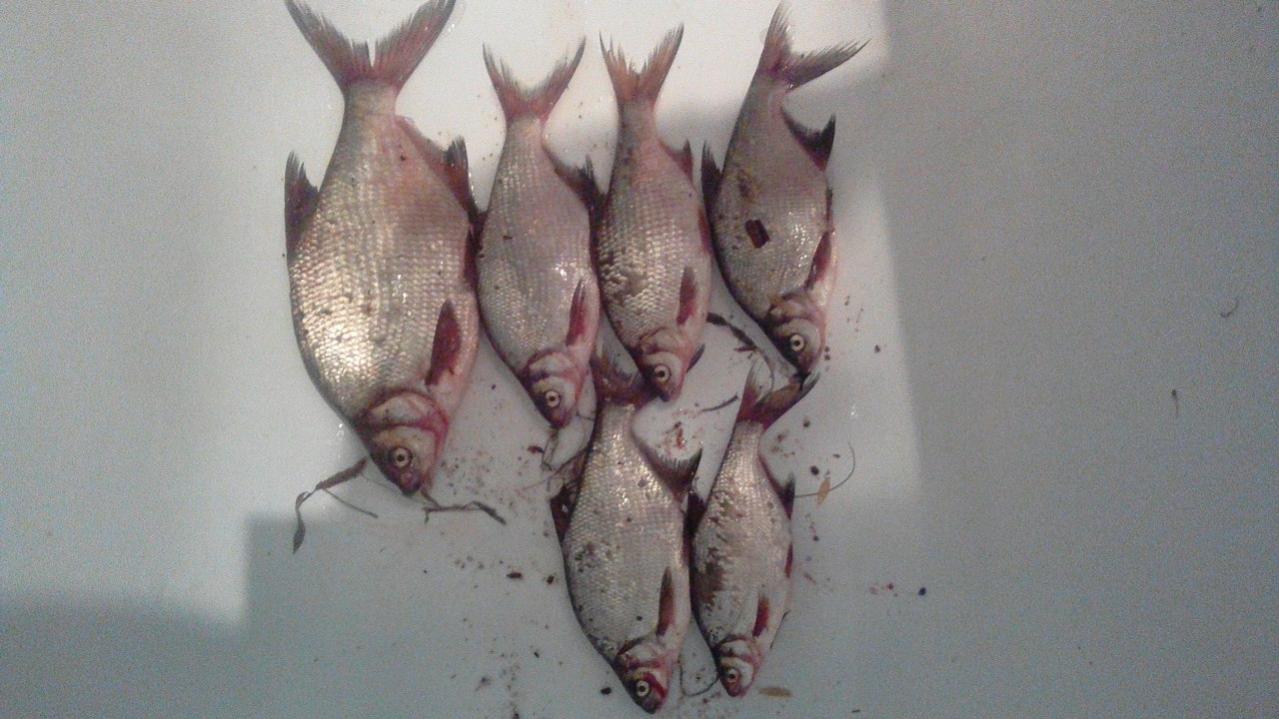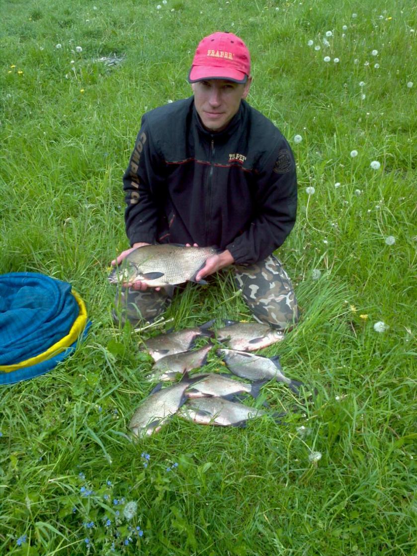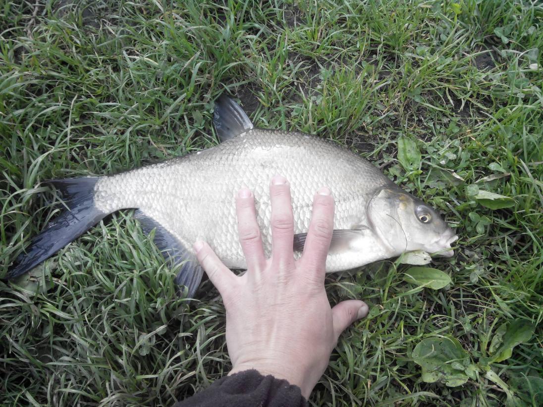 • Сегодня с другом, наверно где-то с 6 утра, хорошая плотва, два подлещика грамм 300-400 и под конец рыбалки, друг зацепил леща за нижний хвостовой плавник. Минут 15 борьбы и я его подхватил подсаком. Лещ завесил ровно 3 кг. Выпрыгивающего сазанчика так же видел но не большого.Нажмите на изображение для увеличения.