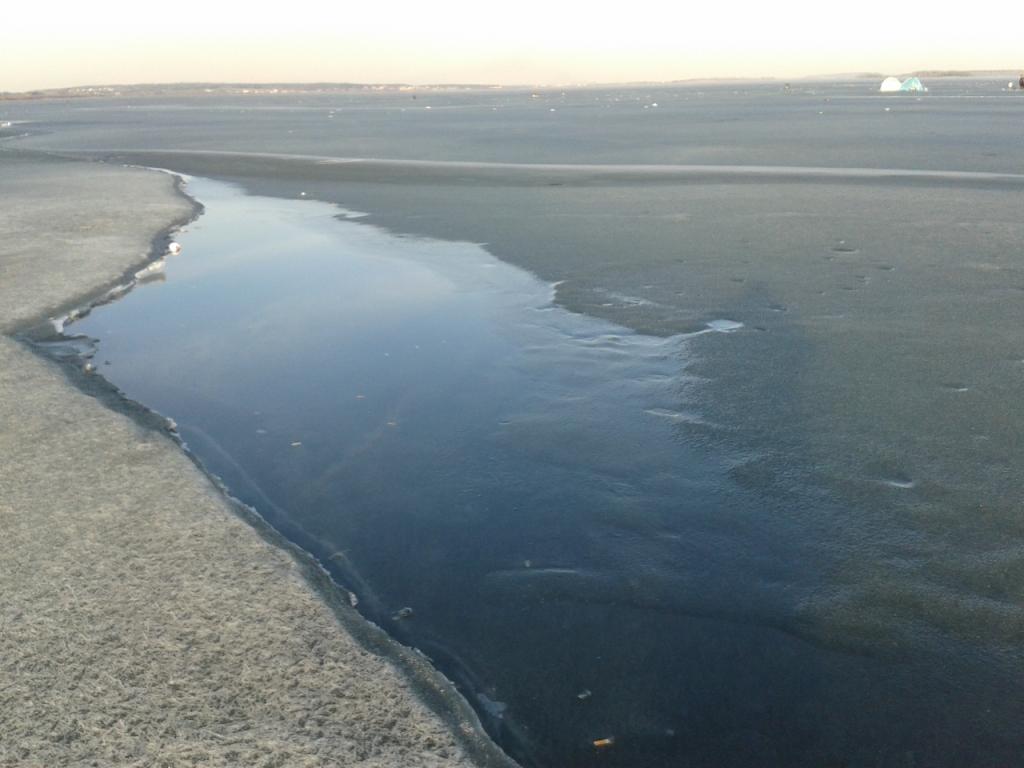 Не был на таком льду лет тридцать. Тогда как-то не было большого волнения, а сегодня день начал с валерьянки... Под'ехали от Лапорович и засомневались сначала: может, вернемся? Лед немного отошел, край обламывается. Переехали, есть заход нормальный. Дальше лед крепкий, толщина разная... И пошли, пешней постукивая. Местами темные пятна довольно большие уже хорошо напитавшиеся водой. Попробовал посверлить такое: три оборота и все. Наклонил бур и пошуровал буром - крошится довольно легко. Это самые опасные места. Хорошо, что снега нет, эти пятна легко заметить и обойти. При свете...