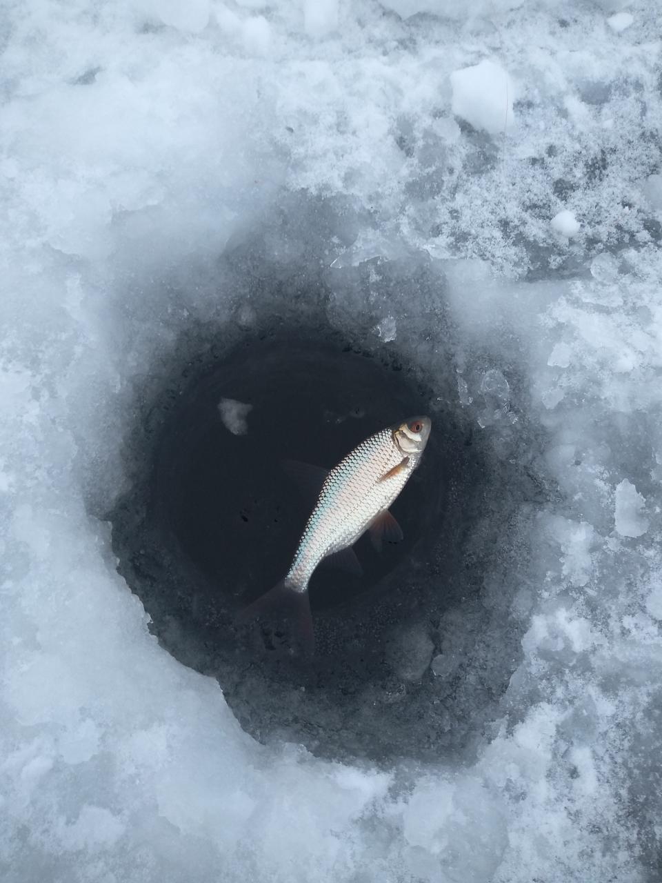ID:	3895833 Хотя и так клевало весь день и во всех закормленных лунках. Мелкая плотва грамм по 40-50 Нажмите на изображение для увеличения.