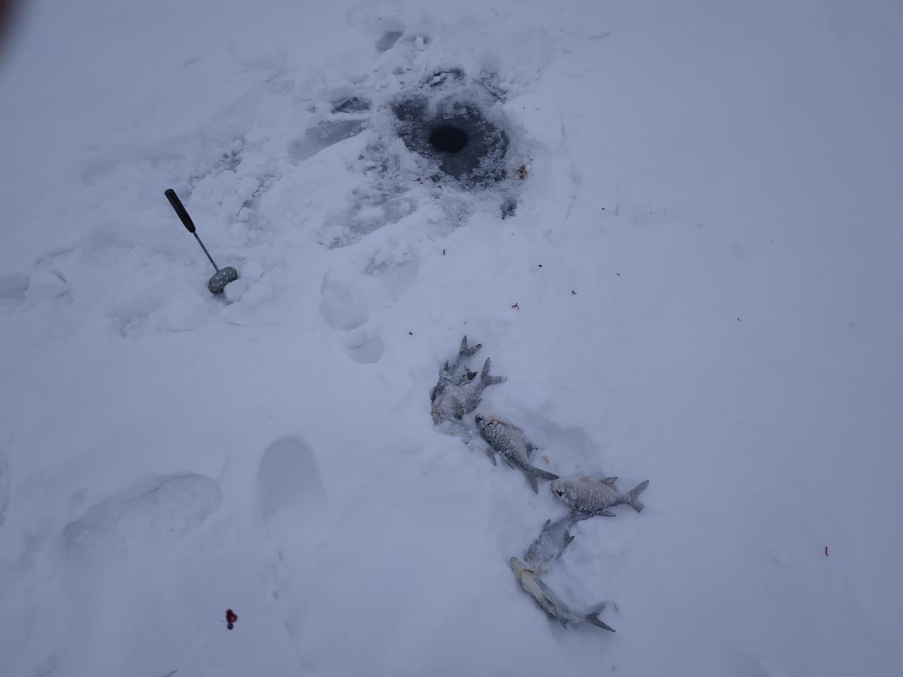 ID:	3895833 Хотя и так клевало весь день и во всех закормленных лунках. Мелкая плотва грамм по 40-50 Нажмите на изображение для увеличения.