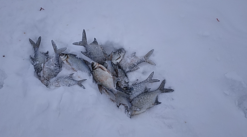 Начало первого, делаю довольно широкий круг из 10 лунок. По очереди закармливаю их прикормкой Absolut сухари/семечки, в которую добавил 100г лиманника. После закорма еще посидел немного, почаевничал, погода хорошая, к беготне не распологает особо, любуюсь просторами и одиночеством. Но, надо как-то и рыбку половить. Первая лунка и полная тишина, вторая-поклевка и мелкий ерш на льду. Начинаю напрягаться, глубина почти 7 метров и тягать ершей с такой глубины удовольствие сомнительное. Неужели с прикормкой пролет? Рыба в этом месте должна быть точно, тут для нее все условия для зимовки. Еще минуту вожусь на ершовой лунке, но безрезультатно. Перехожу на 3-ю лунку, мормышка едва касается дна, как кто-то сразу пытается ее вытолкнуть обратно на лед. Короткая подсечка и на другом конце приятная тяжесть. Выдыхаю с облегчением, это не ерш, это то, за чем я сюда полз. Первый подлещик на льду. Второй заброс, пару шевелений мормышкой по дну и кивок опять выпрямляется, очередной подлещик хватает морозный воздух. С этого момента клевало уже стабильно и на всех лунках. 3-4 рыбы с лунки достаешь и переходишь на следующую, этой даешь отдохнуть, чтобы рыба не настораживалась из-за пропажи товарищей по стае :) Такой отдых очень положительно сказывался на клеве, рыба брала максимум со второй проводки, чаще с первой. Ближе к 3-м часам были убиты почти все удочки, поэтому решил сворачиваться, да и рыбы на вскидку уже около нормы (дома оказалось чуть больше 4.5 кг). Метрах в 50 сидели два рыбака, подошел к одному из них, поинтересовался клевой. А с клевом там оказалось все плохо, у них только утром поклевало немного и все. Т.к. на моих лунках на затихание еще и намека не было, предложил дядькам перебраться на мои "сотки". Долго уговаривать не пришлось :) С первой же занятой лунки один из компании тут же получает серию из трех подлещиков, слышу в свой адрес слова благодарности, мелочь, но приятно :) Уже когда выдвинулся домой, кроме слов благодарности, сказали, что прикормка у меня хорошая, пускай будет так, я не отрицаю ;)