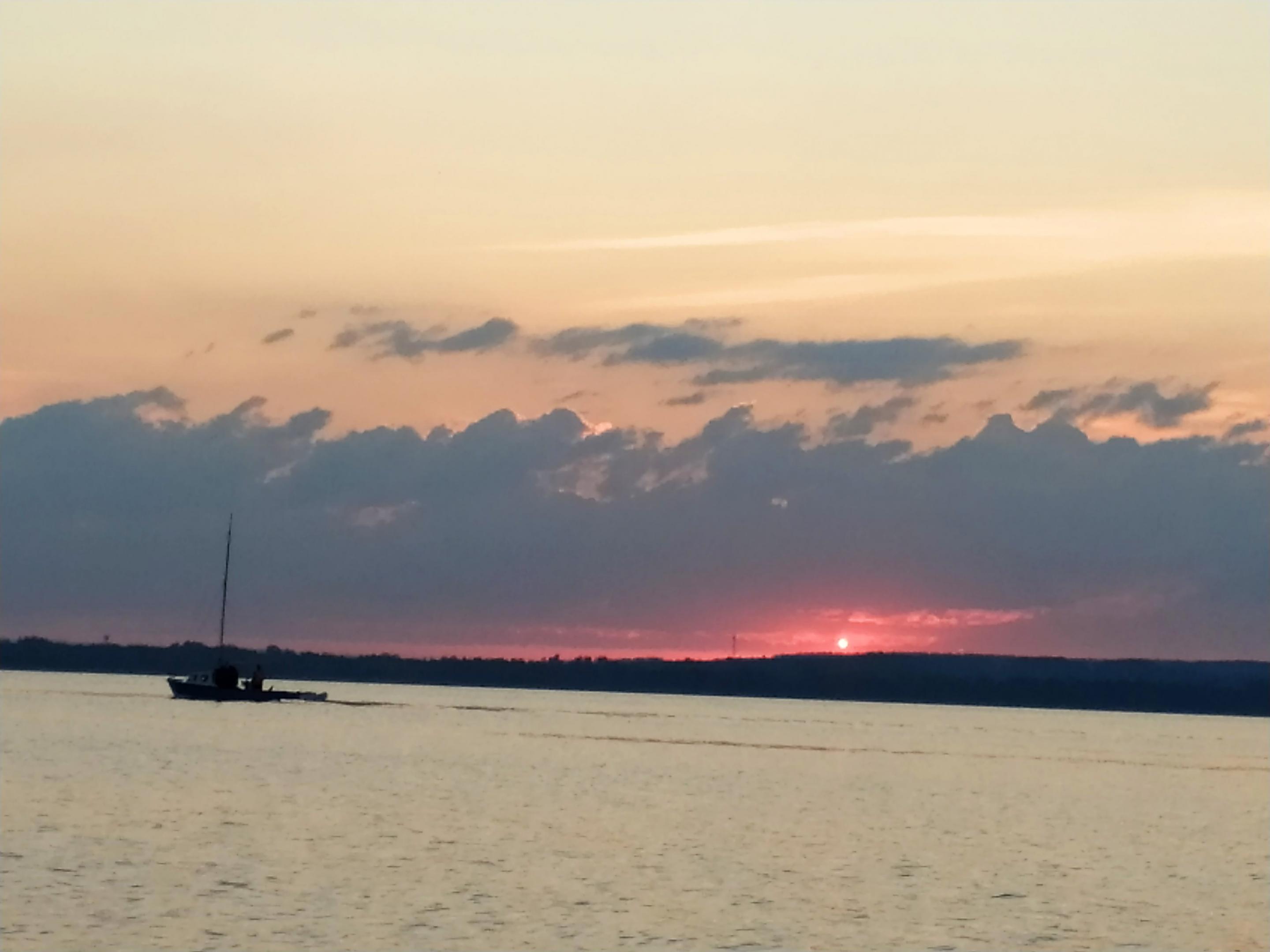 Перекусили и торопимся выплыть на лодке - надо успеть посмотреть закат, а заодно и место для рыбалки поискать. В этот раз решил, наконец-то попробовать свою зимнюю обновку - эхолот практик. А то с нашей зимой так и пролежал новенький в коробке.