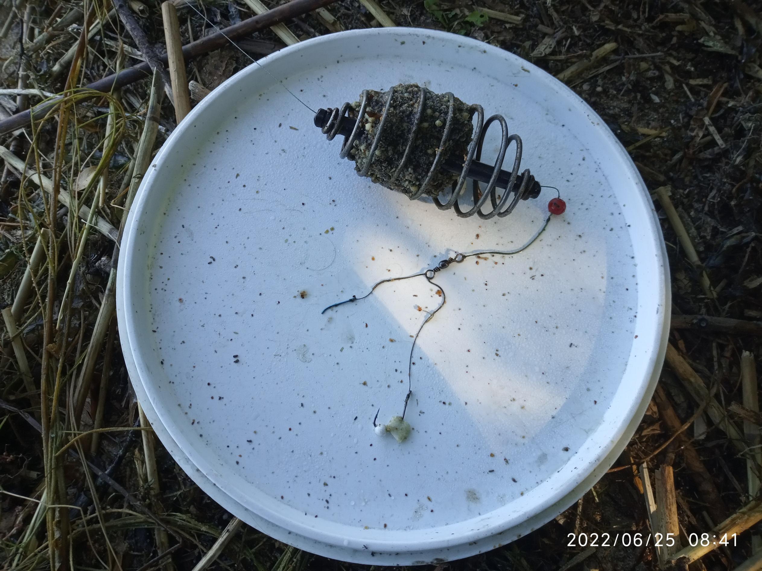 Кормушка скользящая типа "спираль"-"арбуз"-"огурец", в нее - каша, к вельтругу́, что к основной жилке привязанный - два коротеньких поводка из плетни́ тоненькой, и все хи́трости моей оснастки. Мне так нравится.