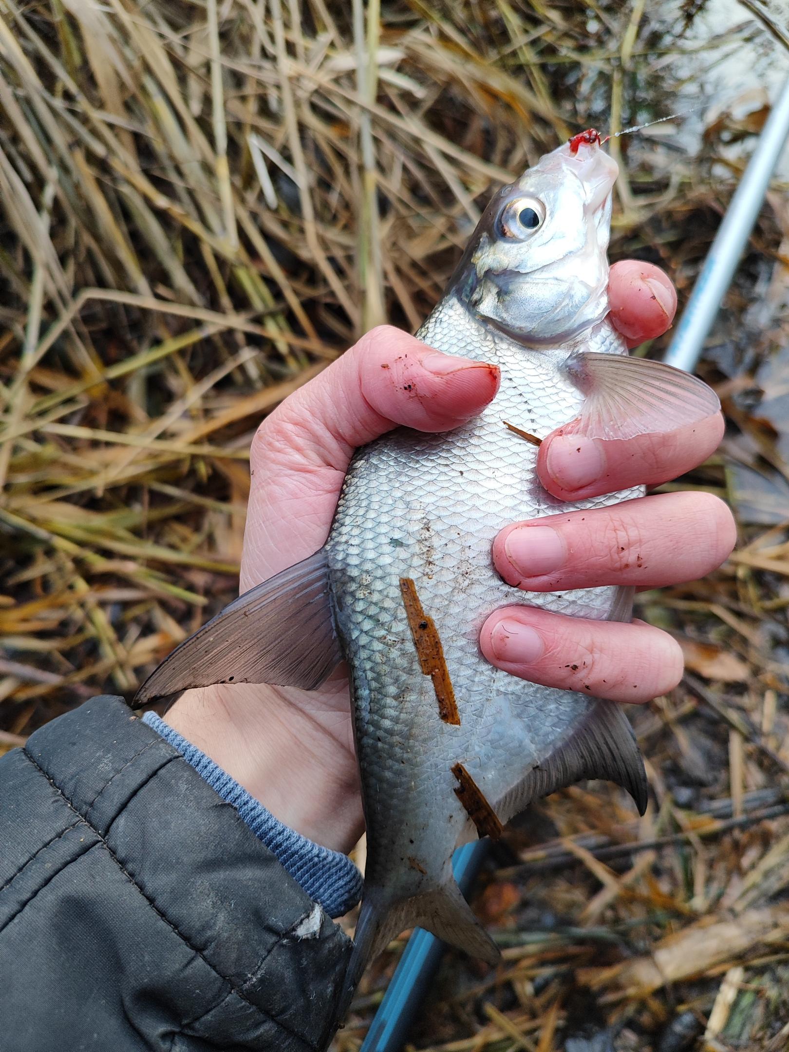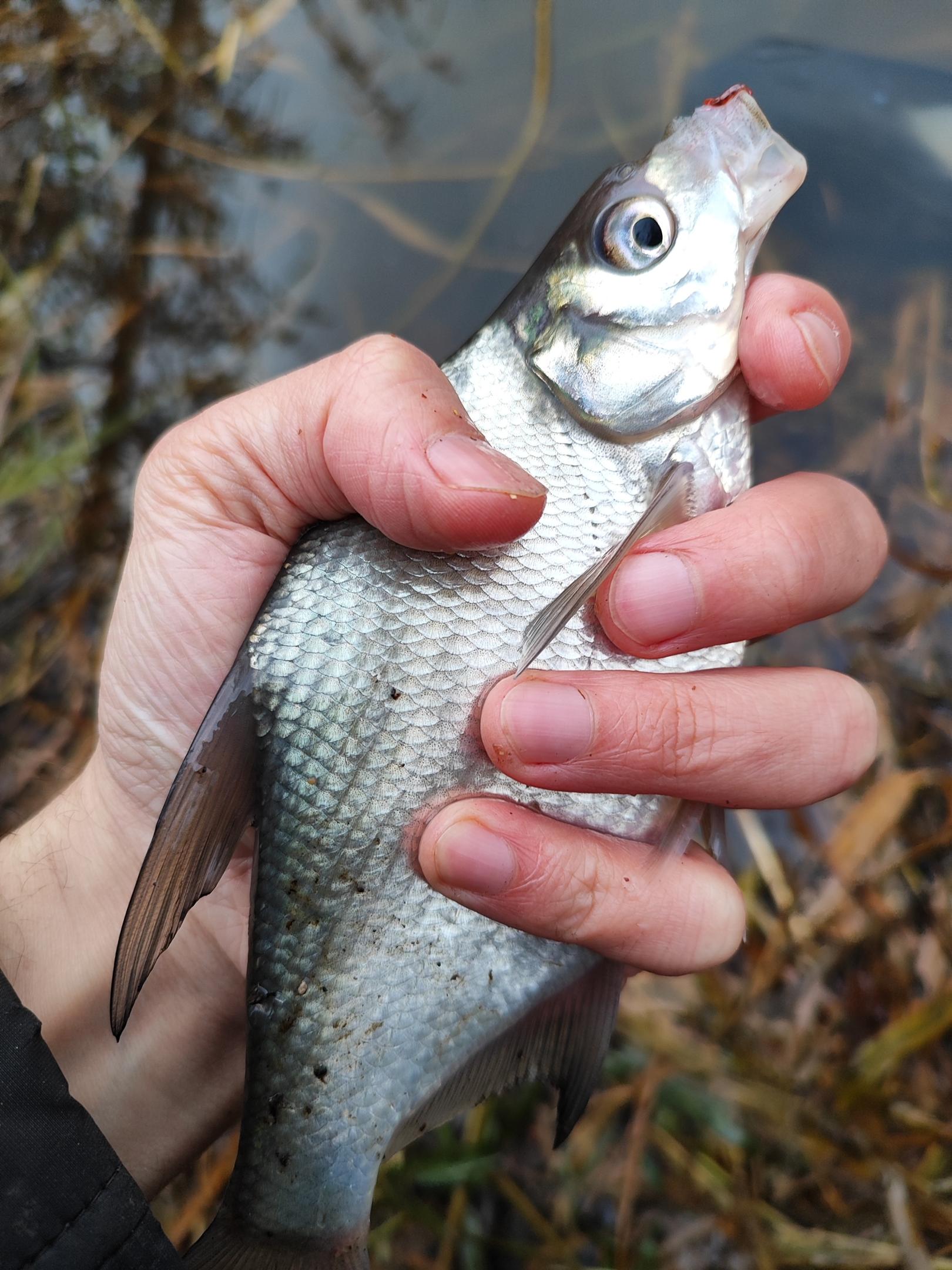 Закинуть из-за бокового ветра было не так просто, ловить тоже - снасть постоянно сносило. На крючке только мотыль. Подкидывал корм после каждого заброса, и вроде как сработало. Скоро попался мелкий подлещик. Продолжал в том же духе, приноровился к ветру - надо было закидывать в закормленное место и придерживать снасть - и дело пошло. Первый вполне значительный подлещик в активе.