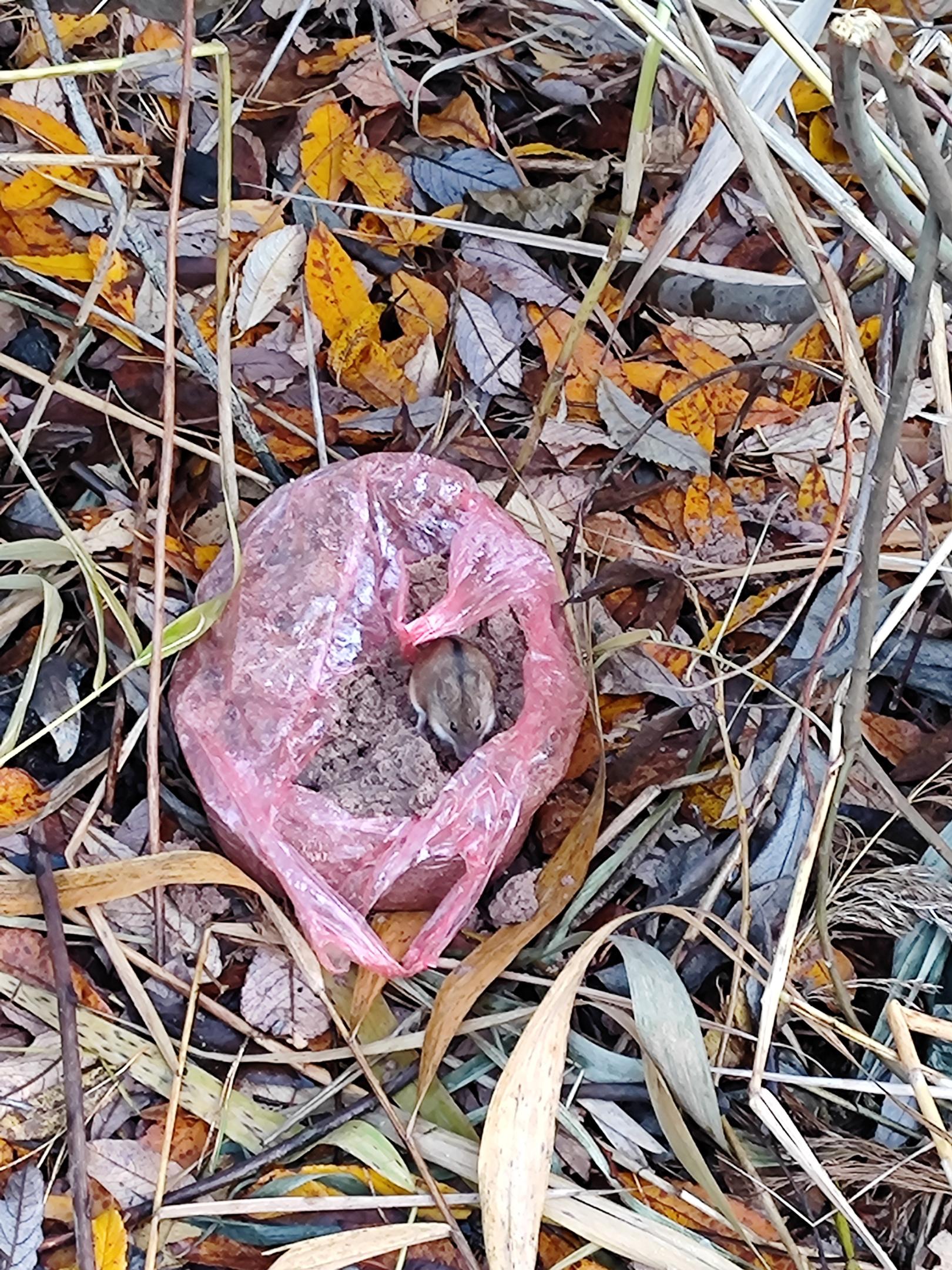Ближе к вечеру пришел грызун - кто-то оставил пакет (как мне показалось, с песком), и этот малыш там копался.