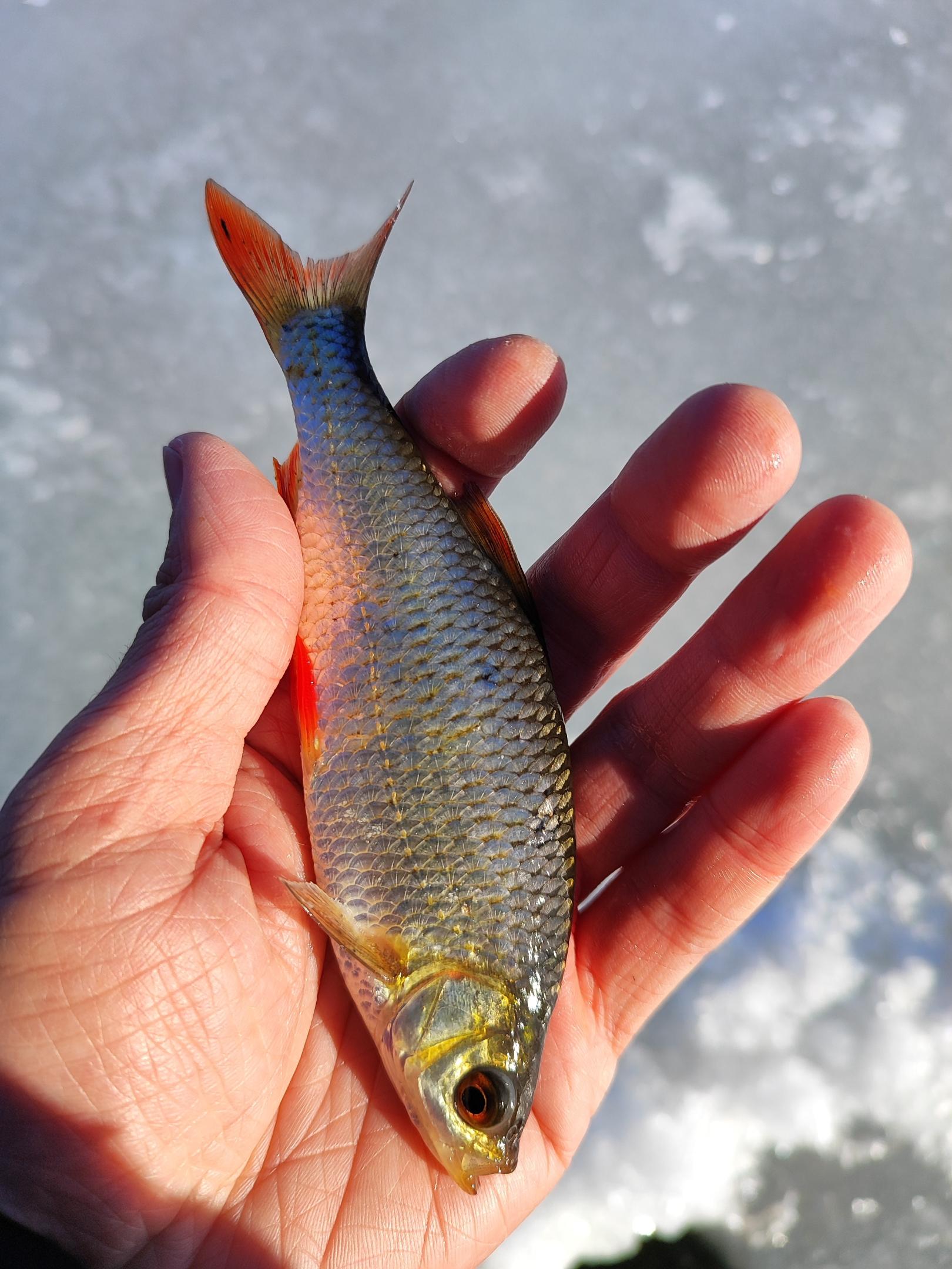 Вернулись к закормленным лункам. И здесь сразу отозвалась живцовая плотвичка. Значит прикормка работает и привлекает рыбу, пусть и мелкую. Мне даже удалось выловить красноперку.