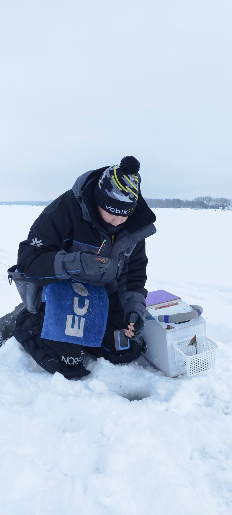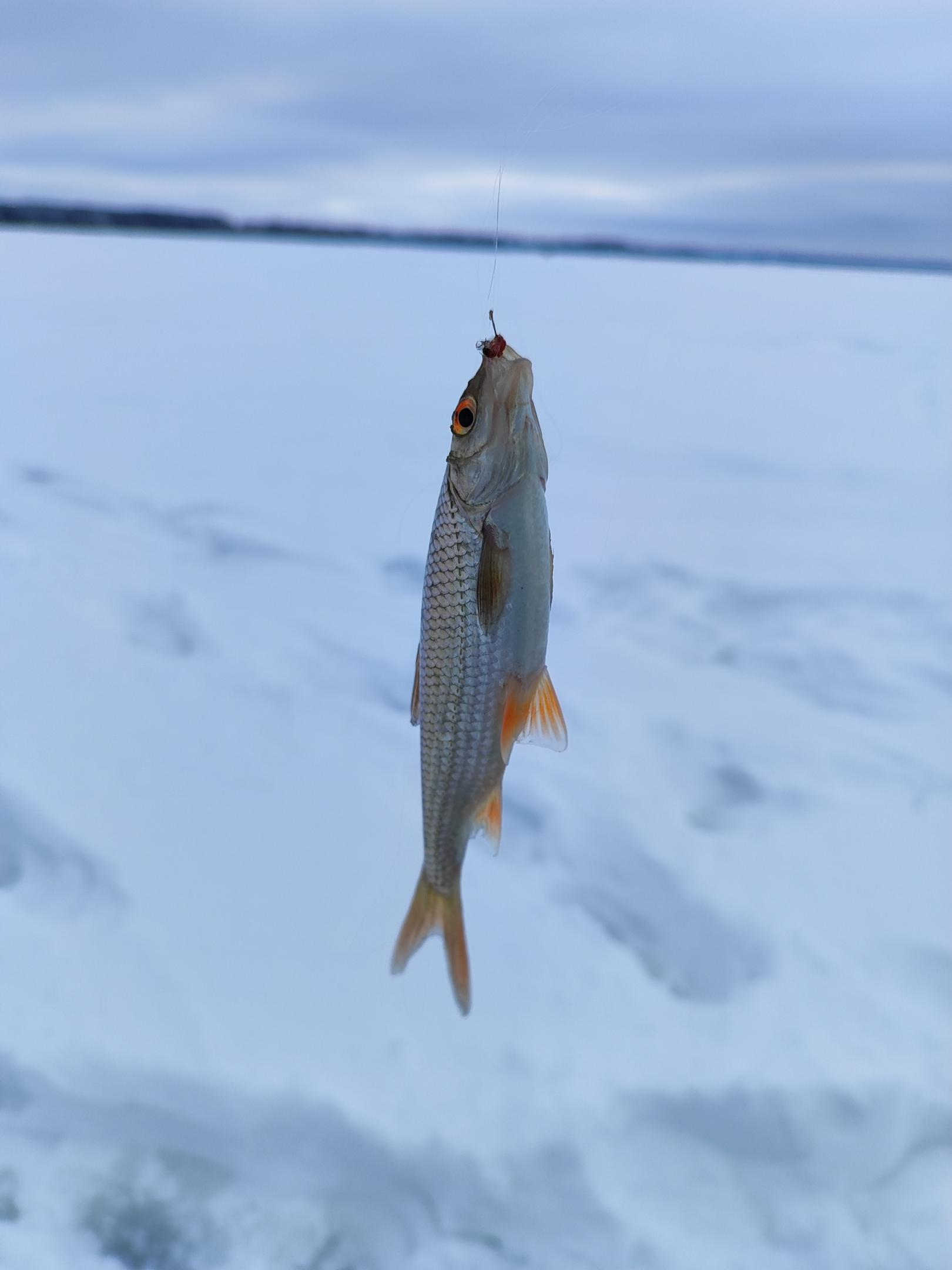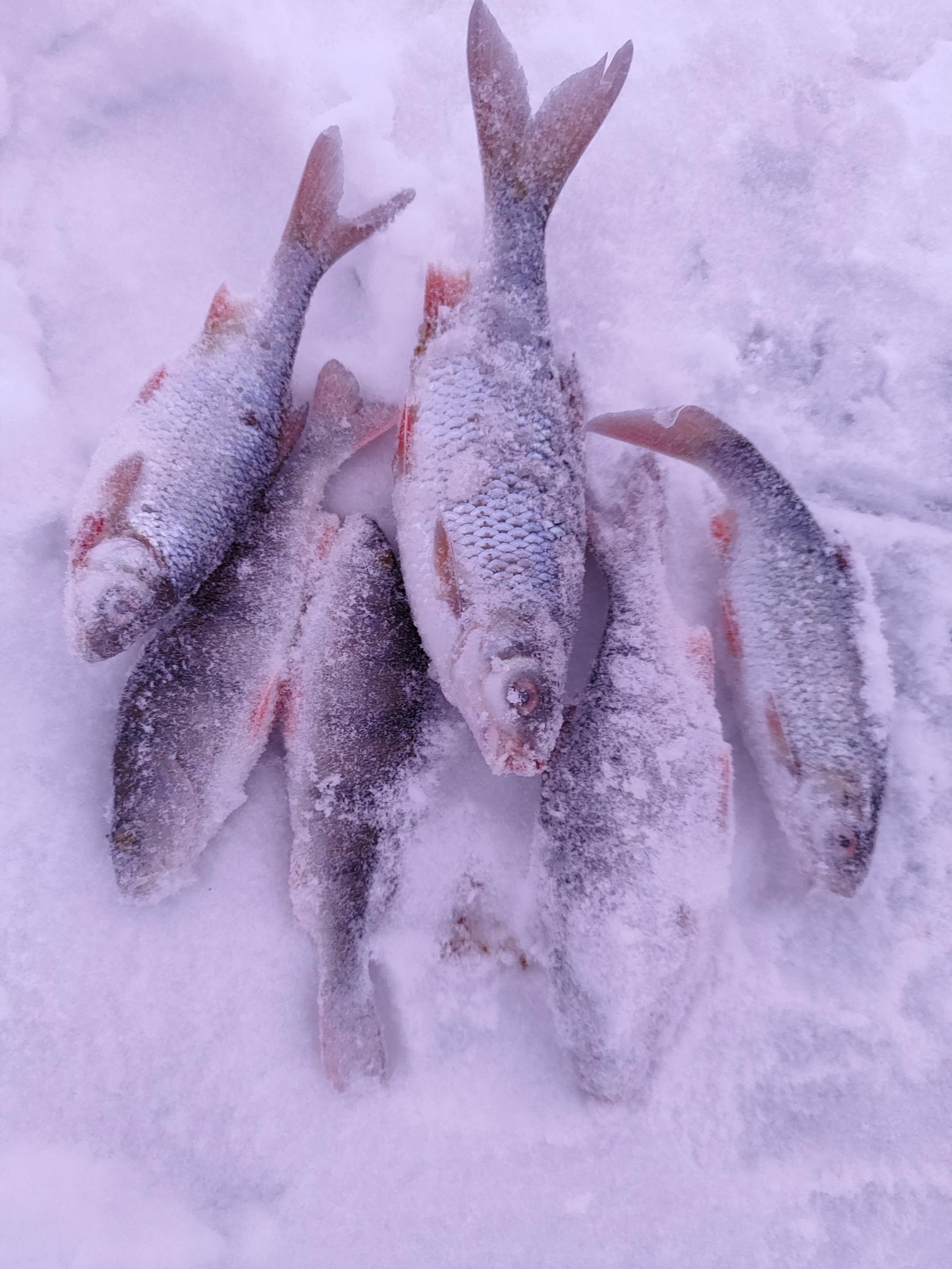 • Всем любителям зимней рыбалки доброго вечера. Сегодня открыл сезон на ММ. От лютого северного ветра укрылся за островом, на солнце было комфортно, ловил без палатки, лунки не сильно мерзли на солнце. На месте был после 12.00. Вся рыба была поймана с одной лунки, до 14.00 рыба была относительно активна, клевал окунек и плотвичка, самые на фото, после 15.00 клев выключили. В 16.00 закончил рыбалку - мороз начал крепчать. Всех рыб отпустил (10 шт)
