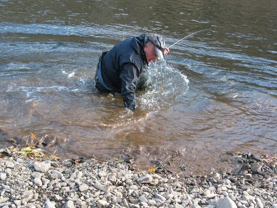 Пришлось распутывать прямо на лету, да и поднырнуть пришлось ( а дело было поздней осенью). Что не сделаешь ради любимого спиннинга, да еще и любимой марки . Упал с головой.