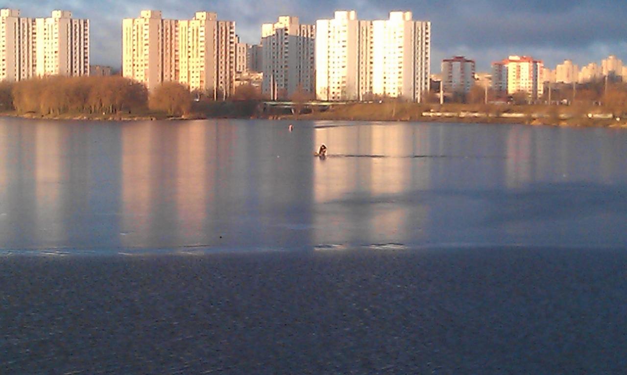 Навстречу, в сторону жилых домов, несётся алень с ящиком и буром. Смотрю - а он по грудь мокрый, т.е. полез на лёд и провалился.