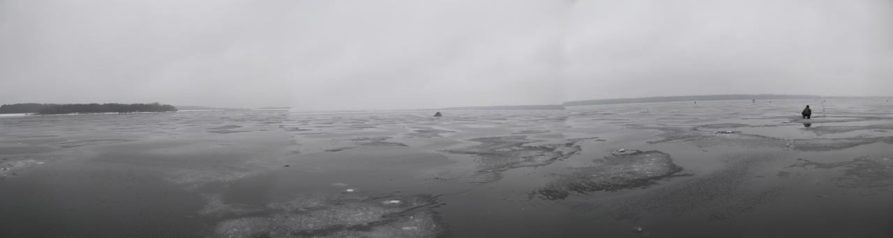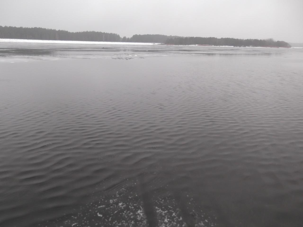 С 9-30 сидели на против полуострова (Малюны). Погода ужас, сначала был ветер, потом дождь , всё сильнее и сильнее лил. Лёд около 10-15, на льду очень много воды