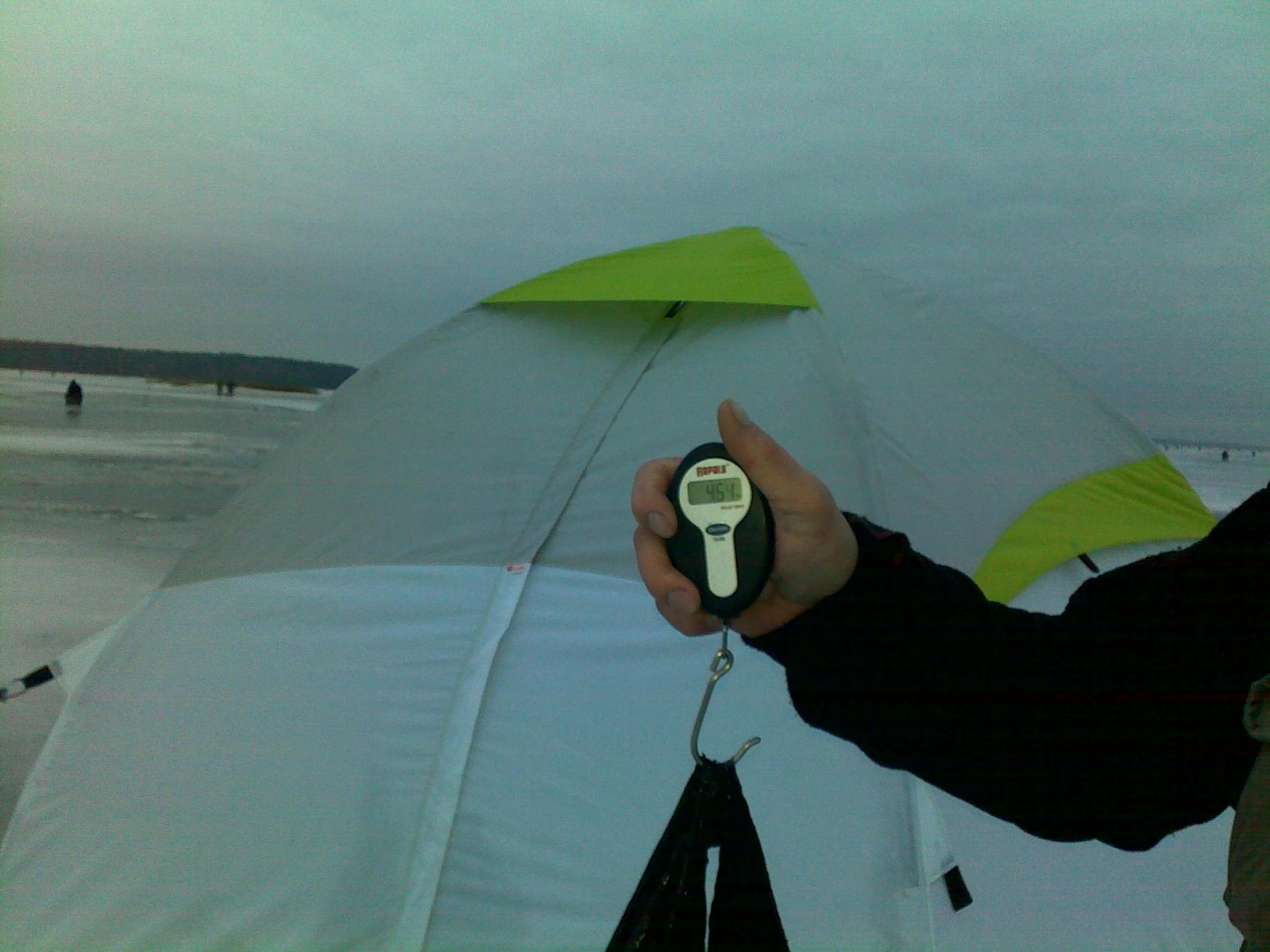 • вчера. район спасалки. 1км по прямой от берега. перепад 7,5м/9,5м. кормил на разных глубинах 8 лунок. палатку поставил на бровке 7,5м. утром ветер штормовой, палатку закрепил, а санки с чемоданом сдуло во тьму. еле нашол. крепил лотос надежда шурупами с кольцом 5х140 - держали супер +2 растяжки, даже не шевельнулась и на ветру на голом льду ее присыпать нечем, да и не обязательно, палатка крепится юбкой наружной, которая прижимает стенки + еще внутренняя юбка есть. У приятеля при разлаживании палатки комфортика зонт - подхватило ветром и вырвало из рук. вернулся он только к обеду, догнал около Рабуни. кормил рс красная+сухари+семки. ч/з полчаса выклалка на поплавочку - подлещ 800г. ну думаю паперло ))) и тишина. бегал по лункам с чертом и поплавочку макал - 0. часов в 12 начался бешенный клев плотвы. итог подлещ + 4кг плотвы около 100г попадалась и неплохая. в 16-00 домой. понравилось всем, кроме "марафонца".