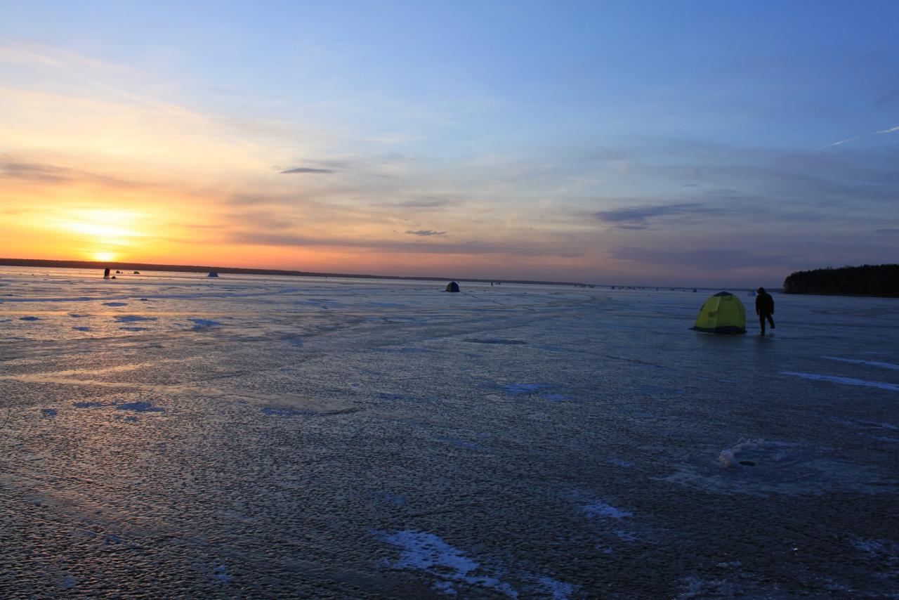 Дождясь 10 утра клева нет и у меня уже чемоданное настроение. Всхоре к 12-13 проснулся наш извозчик) говорю собираемся? Он мне наверное да), я подтверждаю сбор. А ветерок та на половину стих и солнце светит. Тратата душа радуется солнцу. Все собрали упаковали остался пол и палатка, обабили замерзший сантиметровый конденсат, обобили почистили скрутили пол. Теперь самый финиш - снять палатку. Выкручиваем вертыши оставляем один - по технологии установки палатки, что бы не улетела в вилейку:-) чистим юбку от примерзшей мокрой шуги и складываемся и упаковываемся в чехол. Собрались в три раза быстрее чем разрбрались. Ждем остальных и едем домой под солнечную погоду и приятный прогноз погоды по радио на дальнейшие дни.