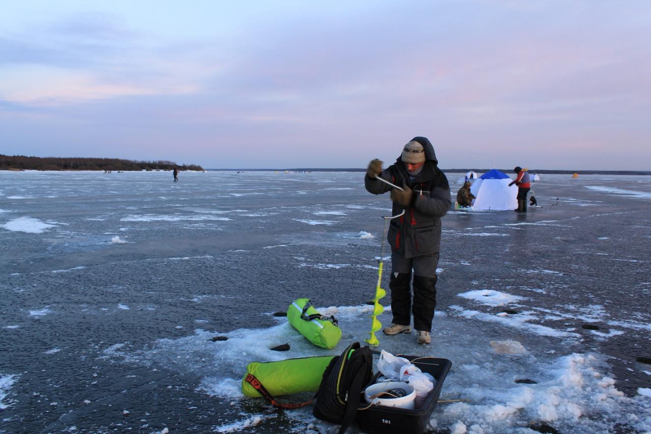 Выходим на лед, ветер бьет в лицо, идти сложно, дошли кое-как до места.... И сразу же начали расставлять ставочки, поставили около 10 штук за час, ветер очень мешал... Но вот и рассвет подтягиваются рыбачки, а мы занялись установкой палатки, будем ловить вдвоем в новой палатке))) Ставили около полутора часов, ну все стоит, сверлю лунки в палатке, так как на засверленные раньше лунки мы естественно не попали(((, кормим, 3 кормушки в каждую лунку. Напарник при очистки лунки от шуги утопил свою ложку, я кормя четвертую лунку утопил кормушку((( ну все, мысли только одни, как теперь ловить? там ложка на дне лежит и кормушка.