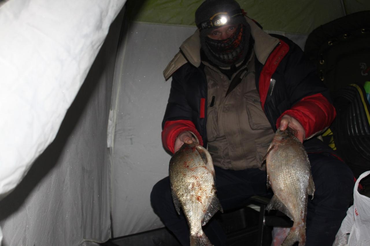 Пока я натаптался пельмешей разложился уже народ рассосался, я в ожидании тишины и подлеща). Повлевок нет ковыряемся в носу в ожидании вечера. Было пару редких поклевак, рыбки словлены. Кормимся на ночь еще мотылем, так для профилактики клева. Клевать начало около началоа десятого - до часа, дальше я не выдержал вялого клева и лег спать до пол пятого утра. Клевало средней поршивости. Цепляя соседние удочки, разгиная крючки...... Вообщем было интересно подержать крупняк на леске 0,10. Проснулся в 4:30 мой братан спит на стуле леска вмерзла, обогреватель еле горит - принимаю решение пора вставать) и этой соне говоря болван ты, хватит спать, заходя на перед скажу: лучше я бы спал)))))