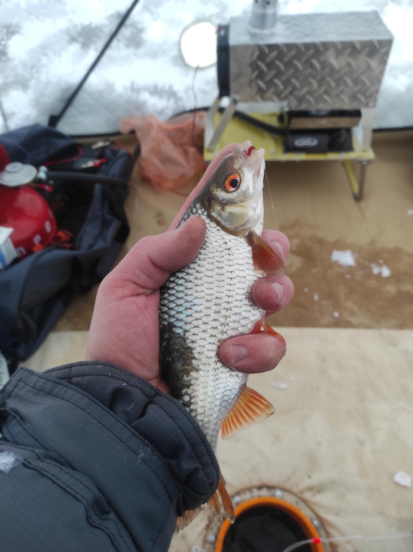 Был в районе Рабуни с субботы на воскресенье, место выбрали выход с русла 6.5м и пару лунок забурлил на 6м . И дайте до места, это было тяжело. Вода под снегом, санки чуть едут ,покуда приволокся до места семь потов сошло. Прикармился и начал ждать , первые рыбки начали брать в районе 10 ч ,а ближе к обеду начало норм клевать . Подались зачётные плотки и хорошая ладожка подлещик.