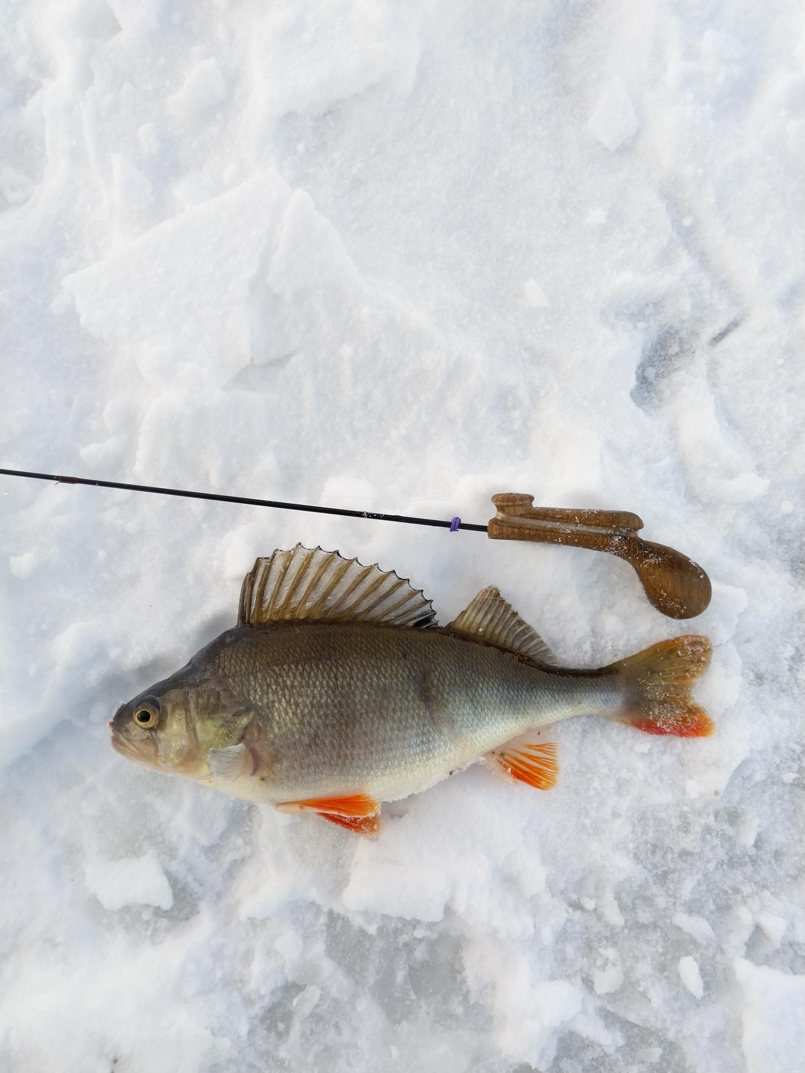 Выдался денёк съездить на рыбалку. Решил махнуть на Вилеечку. Пора уже, лёд стоит, снег лежит. Поехал с отличным блеснильщиком. Были в первой зоне. Утречко у берега - ничего. Решаем оправиться в поиск. И вот здесь прилетело - здравствуй снег. Идти тяжело, сугробы, под снегом вода. Но прорвались. Андрей на 3 метрах, я ушёл на русловой свал. На 5 метрах окунь есть. Нюхает. Хватка, подсечка - есть! И тут же обрыв - ни окуня, ни блесны. Подвёл узел на карабине - устал. Перевязался. Окунь клевал до 3 метров, но размер до 70 гр. Проверил ещё закоряженные пупки - та же мелочь. К обеду вернулись назад, к берегу. Мокрый, и чуть ноги волочу. Передохнул. И начали ловлю. Окунь отзывается, и даже неплохой. Частенько багрилась плотвичка мелкая. Всунули камеру - первый слой плотва, второй мелкий окунь, третий окунь покрупнее. И далеко ходить не надо. 30 метров от берега, пофигу сугробы. В общем с обеда наслаждались рыбалкой. Окунь клевал волнами. Были серии по 5-7 с лунки. Размер неплохой. Потом тишина, новые лунки, и снова клёв. Я топил всё, что меньше 70 грамм. Пик клёва был с 13 до 14. А вот после 15 подошли бонусы. Об одного оборвал блесну на подсечке - тяжёлый был. Андрей взял первого - 760 гр. Я тут же взял второго - 570 гр.
