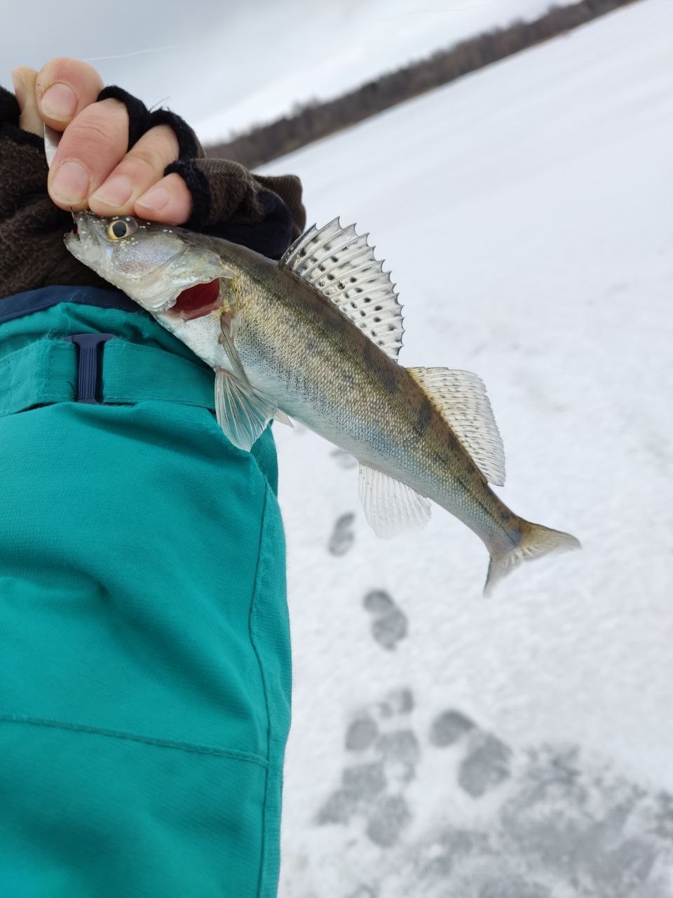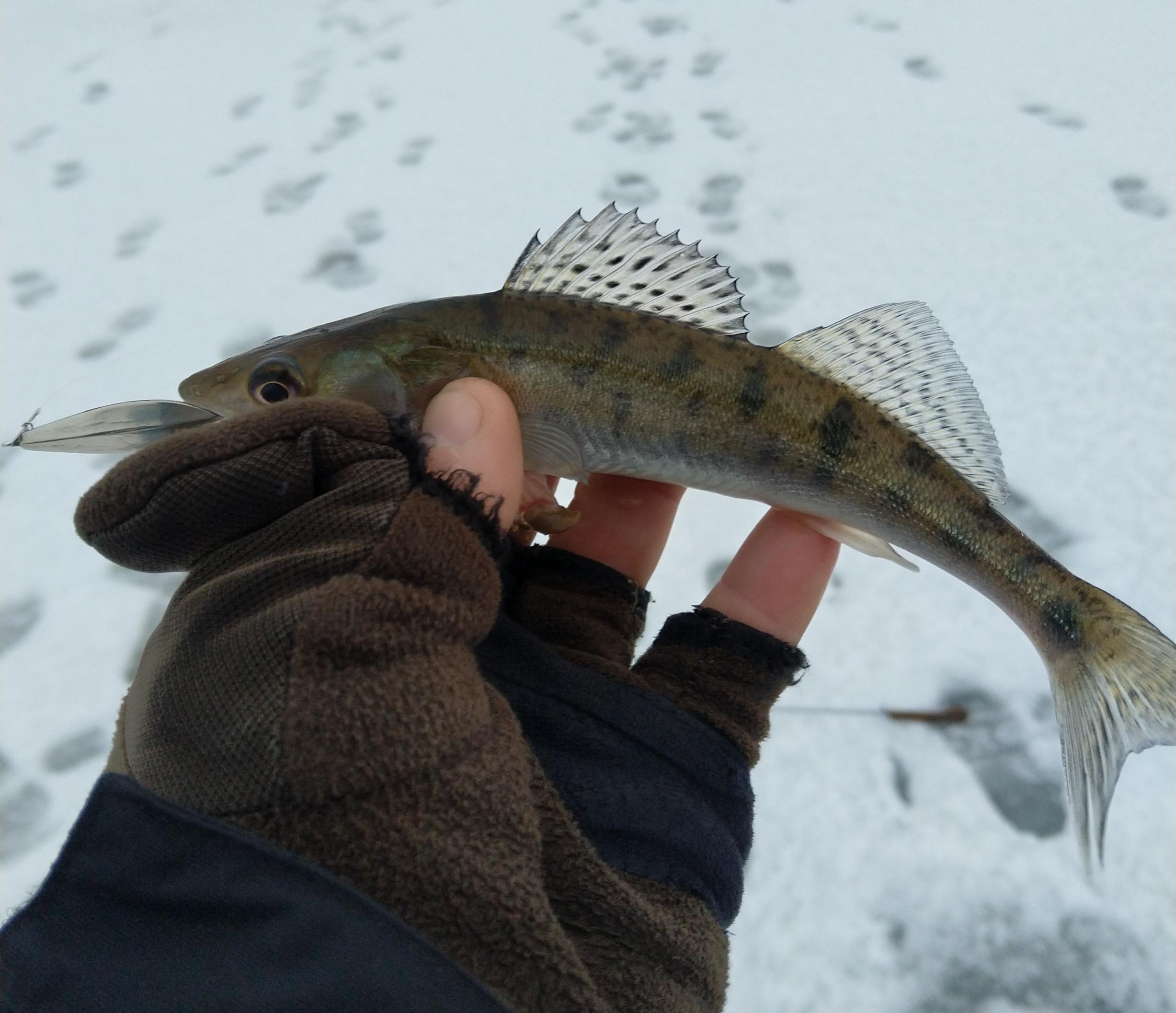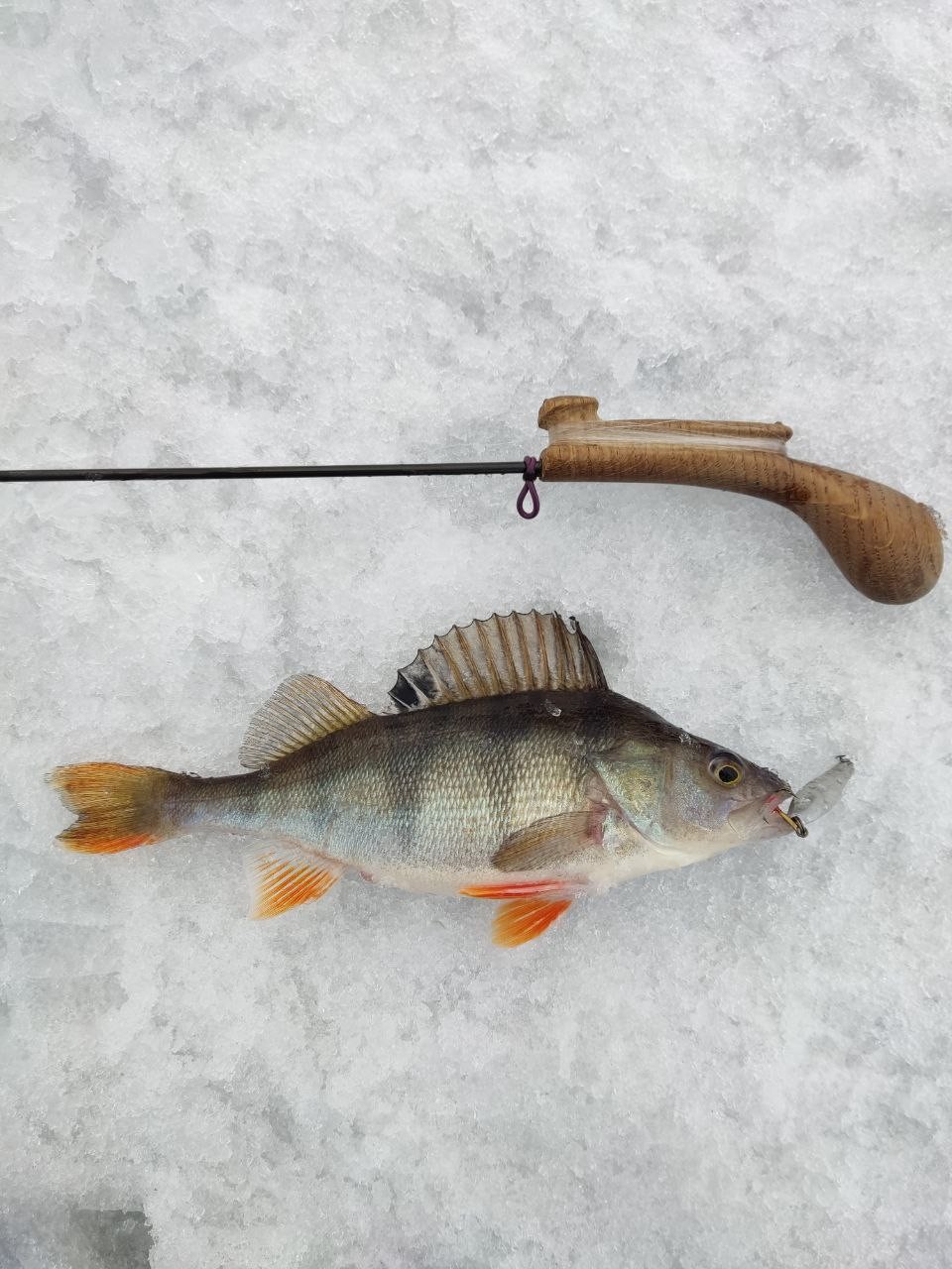 Отправились в поиск. Разбурили рабочую точку на глубине 2,5 метра. Уже заканчивали последнюю лунку облавливать и уходить - у Наташи подряд три поклёвки - двоих достала, одного покрупнее слила.