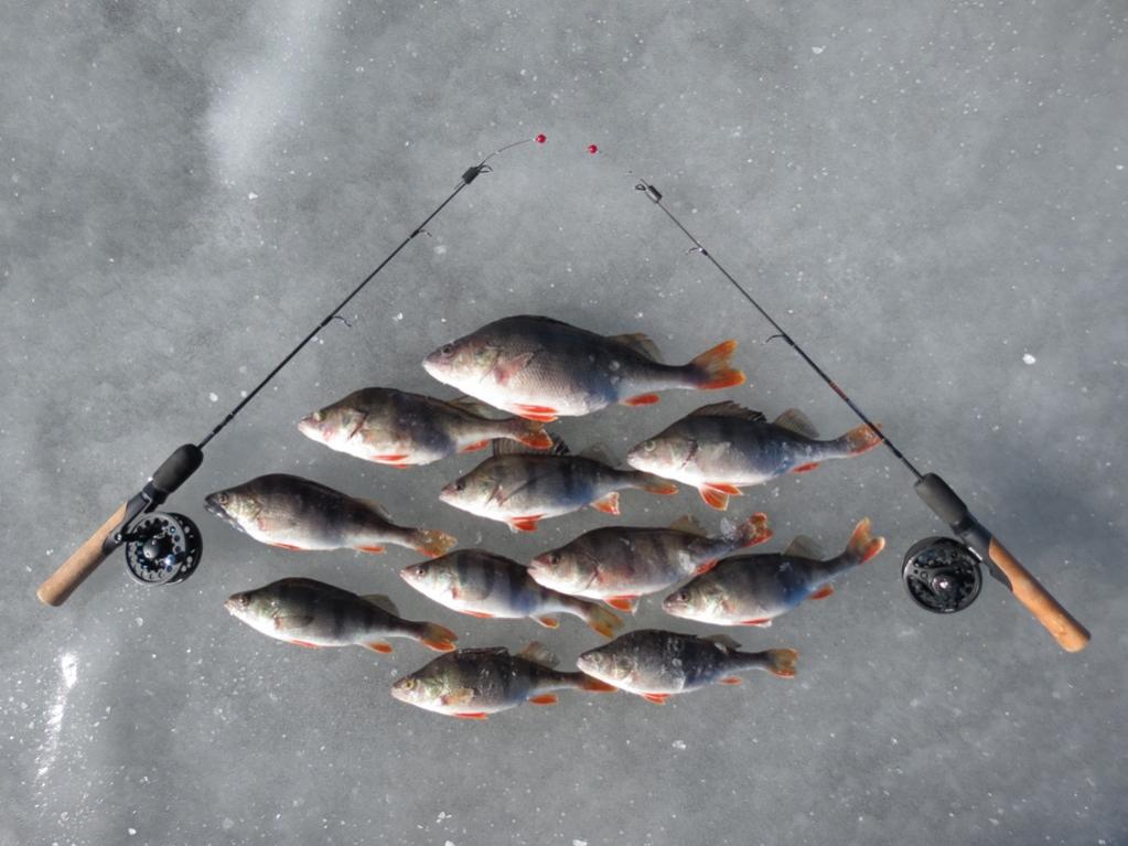 Но окунь клевать не особо горазд - стоит локально, на небольшом пятаке 50х50 метров, и привязан строго к корягам. Практически каждую поклёвку приходится "умолять". Ловили на "балду". Иногда поклёвку приносил только 3-й подход к лунке. Так, потихоньку, мы и "выковыривали" полосатых из-под коряг. После 15-00 окунь замолчал совсем. По всему должен быть вечерний выход ближе к 17 часам. Но у нас уже было 11 добротных окуней, и 4 отпущенца. Посему дальше не упирались и отправились на берег. На жарёху есть, да и на работу завтра - надо отдохнуть. Самый крупный завесил 450 гр.