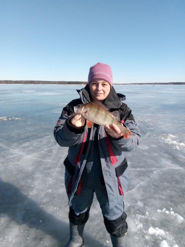 Первая серия лунок. Как только "выхожу" на верхнюю бровку, поклёвка - мимо! Ещё взмах - поклёвка, мимо! Только после 5-6 взмаха удаётся подсечь, и на том конце чувствуется увесистый парень! Недолгая борьба, и полосатый красавец на льду - на вскидку грамм 150-200. Отлично - начало положено! Проверяем первую серию - тишина. А дальше разбуриваем пятак. Пару лунок прошли, и вот Наташа уже аккуратно машет руками - на том конце что-то поувесистей. Так и есть - на солнце появляется достойный бонус сегодняшнего дня.