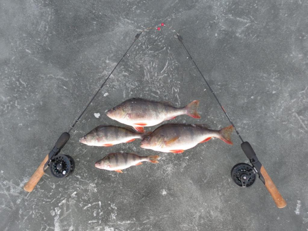 Но закрались сомнения - ежели сразу, да такой бонус?:cool: Так и вышло - окунь клевать отказывался. Через 2 часа,:o Наташа опять к заветной лунке. Пару взмахов - есть! Второй брат, близнец первого!