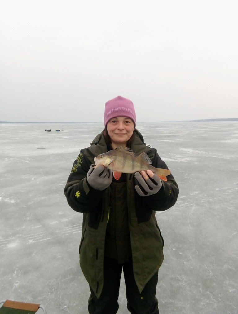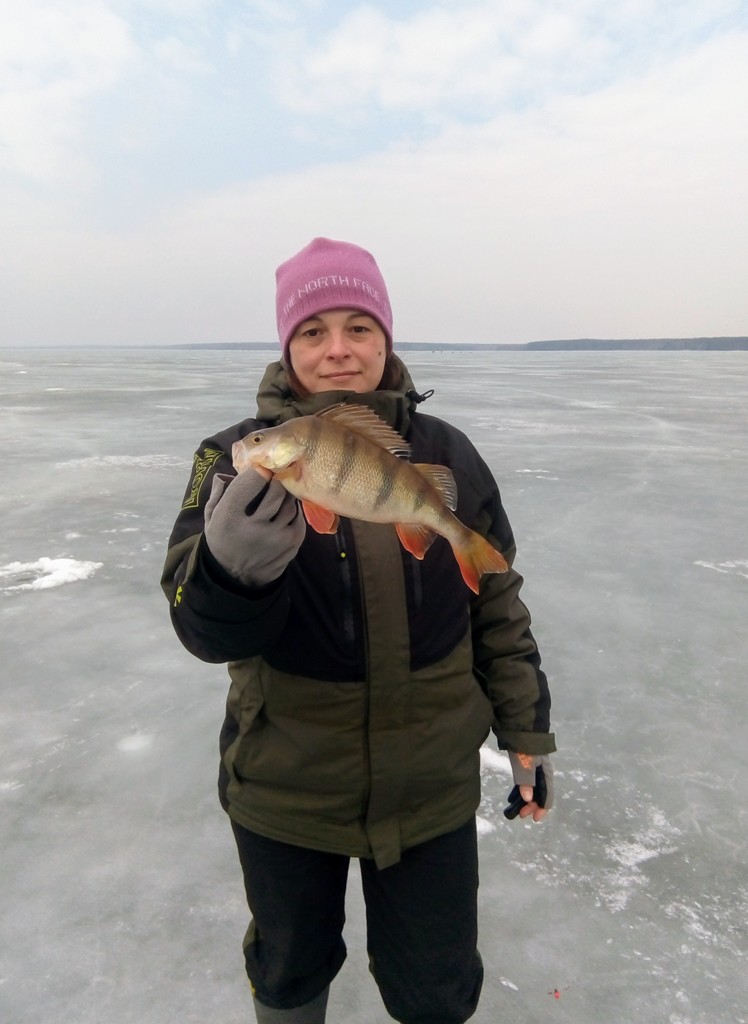 Сразу на первую точку, и Наташа уже на второй лунке берёт красавца! Начало положено.