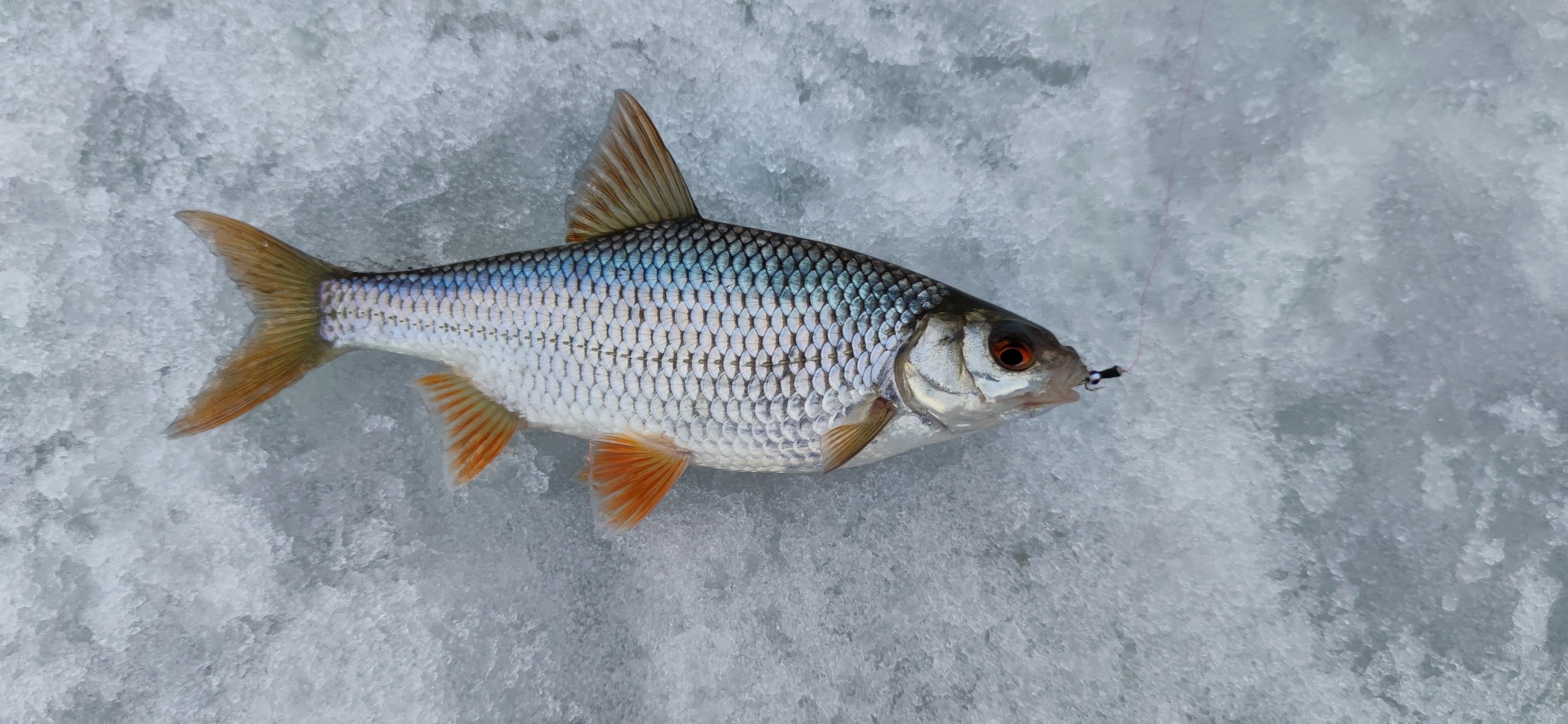 Из неприятного. Рыба сильно часто попадается покоцаная. То без чешуи частично, то с поломаными плавниками, то со странными ранами (как на фото, это не живец). Отобрал 5 плотвиц что побольше. И они заражены лигулёзом оказались. Нашёл вмёрзшую сеть. И это в самом глубоком месте. Ну и оставленные бутылки из-под чернила на льду и прочий мусор. Беда!