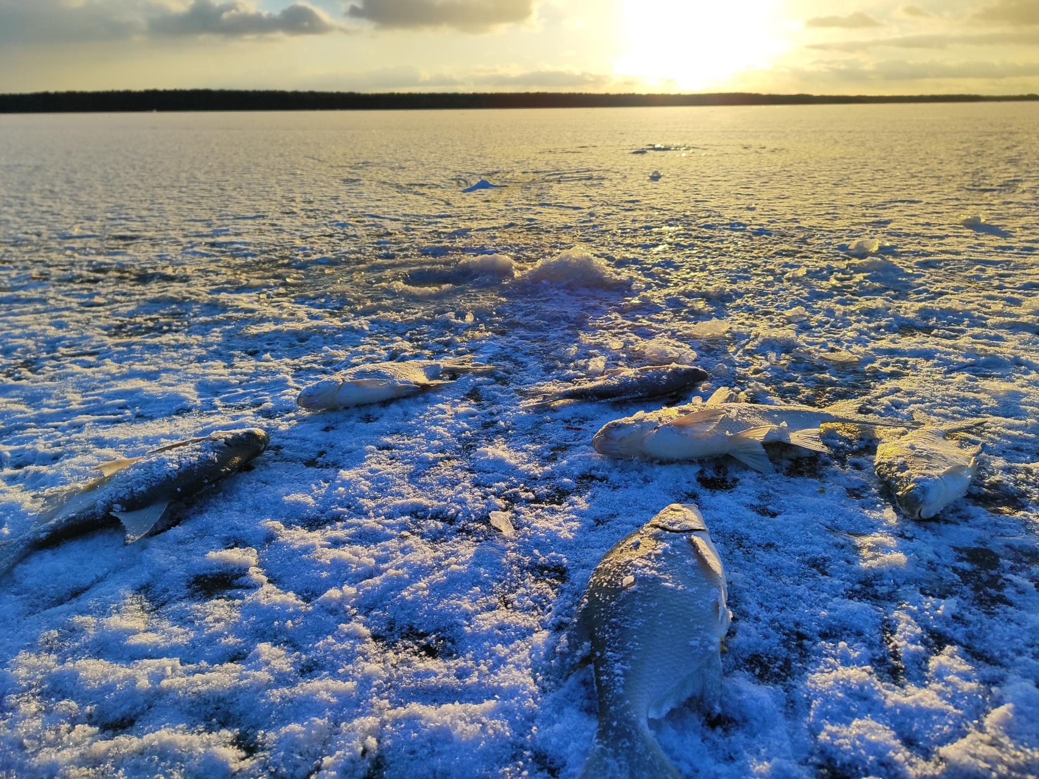 • Прибыл на водоем в воскресенье,так как судя по истерии на лиман,ожидался аншлаг,как в детские и молодые годы на стадионе Динамо 50050 человек.Забурил на разных глубинах лунок десять, ближе к обеду стали откликаться,но своеобразно,после подъёма на полметра с последующим опусканием следовала выкладка,значит стоит над дном.Закорм на ночь лиман плюс сыпуха.Вне палатки ловили до темна,пока были видны поплавки.Утром я усомнился в том,что Вилейский лещ сильно пуглив,батя закинул удочку в прорубленую лунку,долбит пешней следующую,выкладка,грамм 600.С рассветом началась раздача,фанеры не было,весь мерный.Бонус в обед, ближе к сборам,что он там подбирал,не понятно, последний закорм был вечером.Все мясо не фоткал,не эстетично))). Как раз загрузка в тару для посола.Сегодня не пошёл,рука бойца колоть устала,и ноги от присяда постоянного болят.Рыбалка удалась ,хотя в начале не сложилось с прикормкой,понадеялся на дачные запасы,а там открытая летняя,плюс импортного пшенкаса наварил.Лимана как всегда больше пол кило не брал,ещё и остался . Барометр тоже какие-то немыслимые цифры показывал 760,потом на пять единиц скинул.