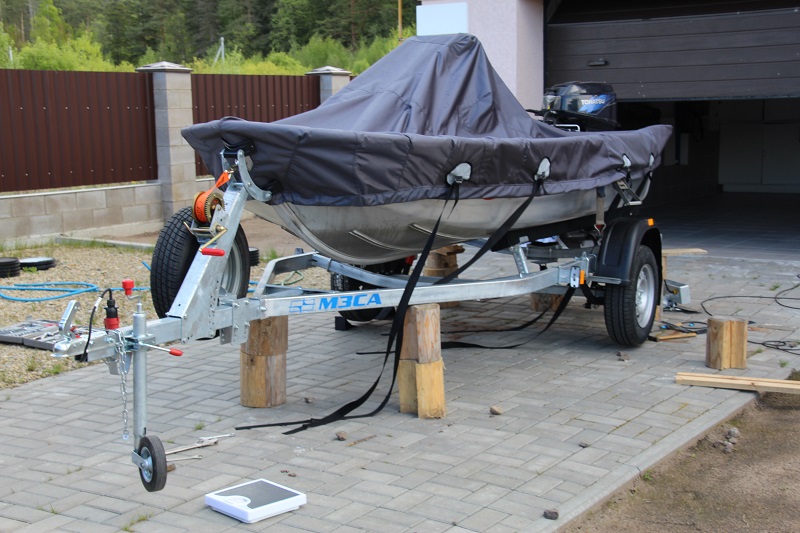 Первым делом нужно было решить вопрос с транспортировкой, выбор наш пал на МЗСА-81771D. Вроде прицеп как прицеп, много их продается разных, ну полностью оцинкован, ну немного помощнее чем у конкурентов рама, ну собран из импортных комплектующих фирмы AL-KO, даже лебедка от AL-KO, однако, на мой взгляд, его сильные стороны это подвеска на рессорах и амортизаторах, которая дает приличную плавность хода и не вытрясает из лодки с мотором все что плохо прикручено на наших дорогах и, самое главное, - «подвижный колесный ход». Переводя на русский язык колесную ось можно смещать вперед и назад добиваясь оптимальной нагрузки на фаркоп автомобиля. Это не мелочь, скажу я вам. Пару лет назад я на своем, тогда еще новом, Рено Дастер ухохатал задние амортизаторы за несколько поездок таская лодку моего товарища. Нагрузка на фаркоп в идеале для легкового автомобиля не должна превышать 30 кг. После установки нашего корабля на новехонький прицеп и транспортировки к месту дислокации, а именно в мой гараж, уже наученный горьким опытом я решил проверить сколько же реальных килограмм давит мне на хвост… В заводской сборке прицепа получилось почти 49 кг. Наверное для Ландкрузера 200 с пневмоподвеской это конечно не проблема, но для нас, владельцев полу легковых автомобилей лучше нагрузку уменьшить. Путем не хитрых манипуляций с вывешиванием прицепа и посредством ключа на 19, четырех деревянных чурок и одного домкрата за часок смещаю ось колесного хода на 20 см и добиваюсь нагрузки на фаркоп в 24 кг.Это совсем другое дело! Опа машины не проседает, при езде тележка практически не ощущается.
