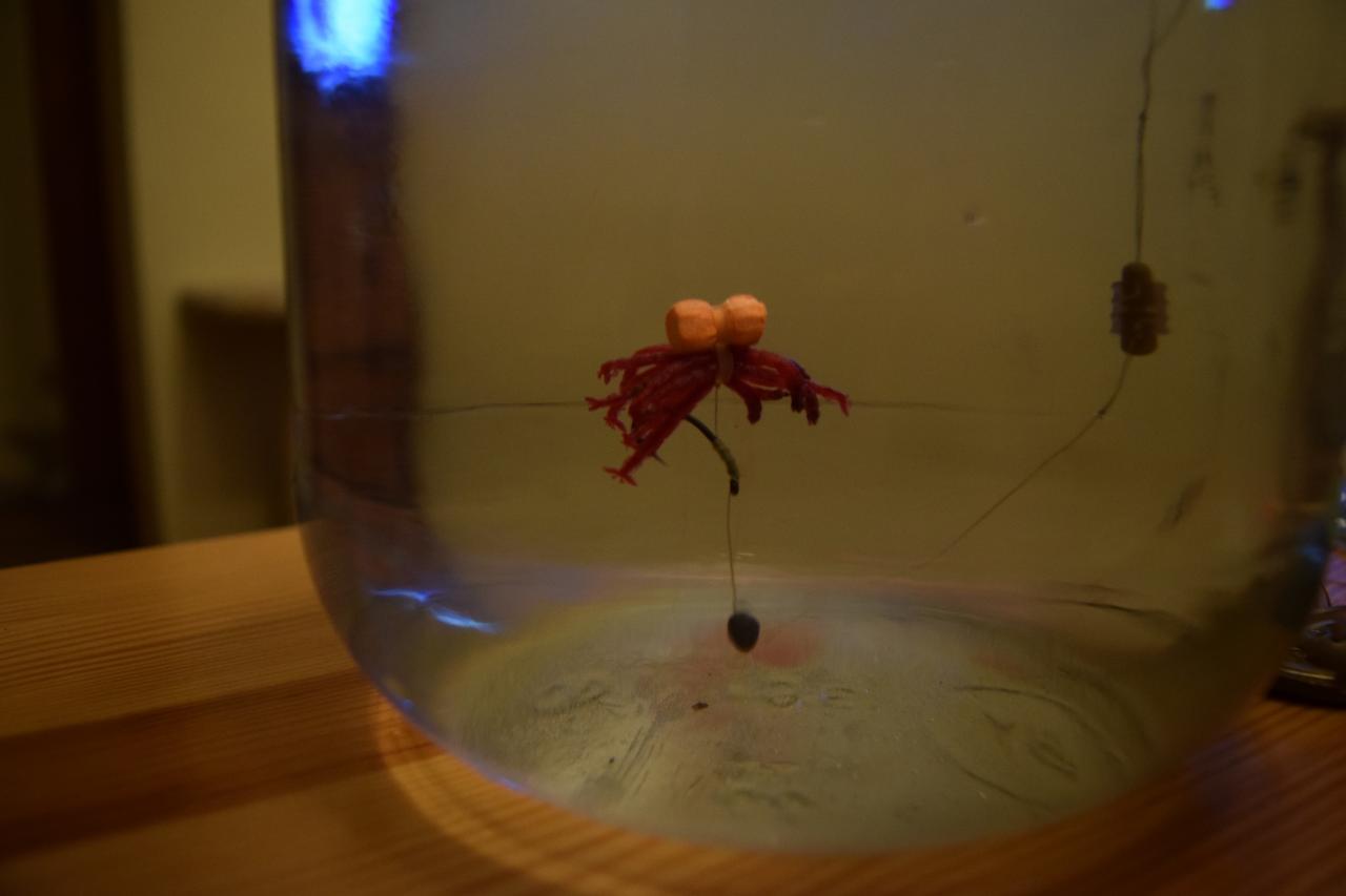 • По мотылю. На крючок вешаю пук мотыля и дополнительно пенопластик, что бы поднять над флетом. На такого плавающего мотыля гораздо больше лещевых поклевок, чем без пенопластика. Но и много холостых поклевок, поэтому и хочу попробовать пучок мотыля на волосе. Волос с колечком, только вместо пеллета - пучок мотыля. Плюс приподнять мотыля пенкой над кормушкой и в 2-3см от крючка на поводке повесить маленькую свинцовую дробинку. Как будет работать такое извращение пока не знаю:D. Главное добиться того, чтобы крючок правильно разворачивался во рту рыбы.