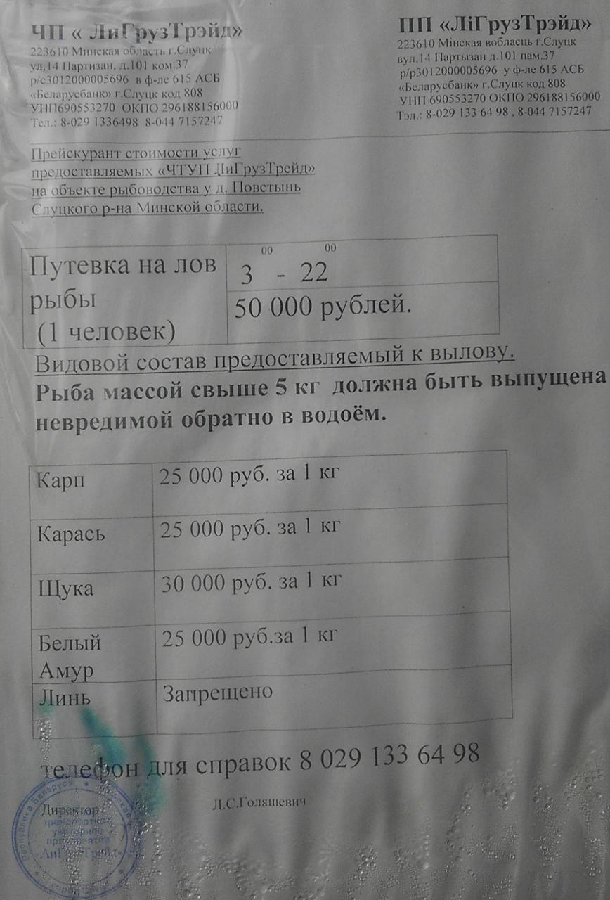 Суточная рыбалка - 22 рубля, норма - 6 кг.